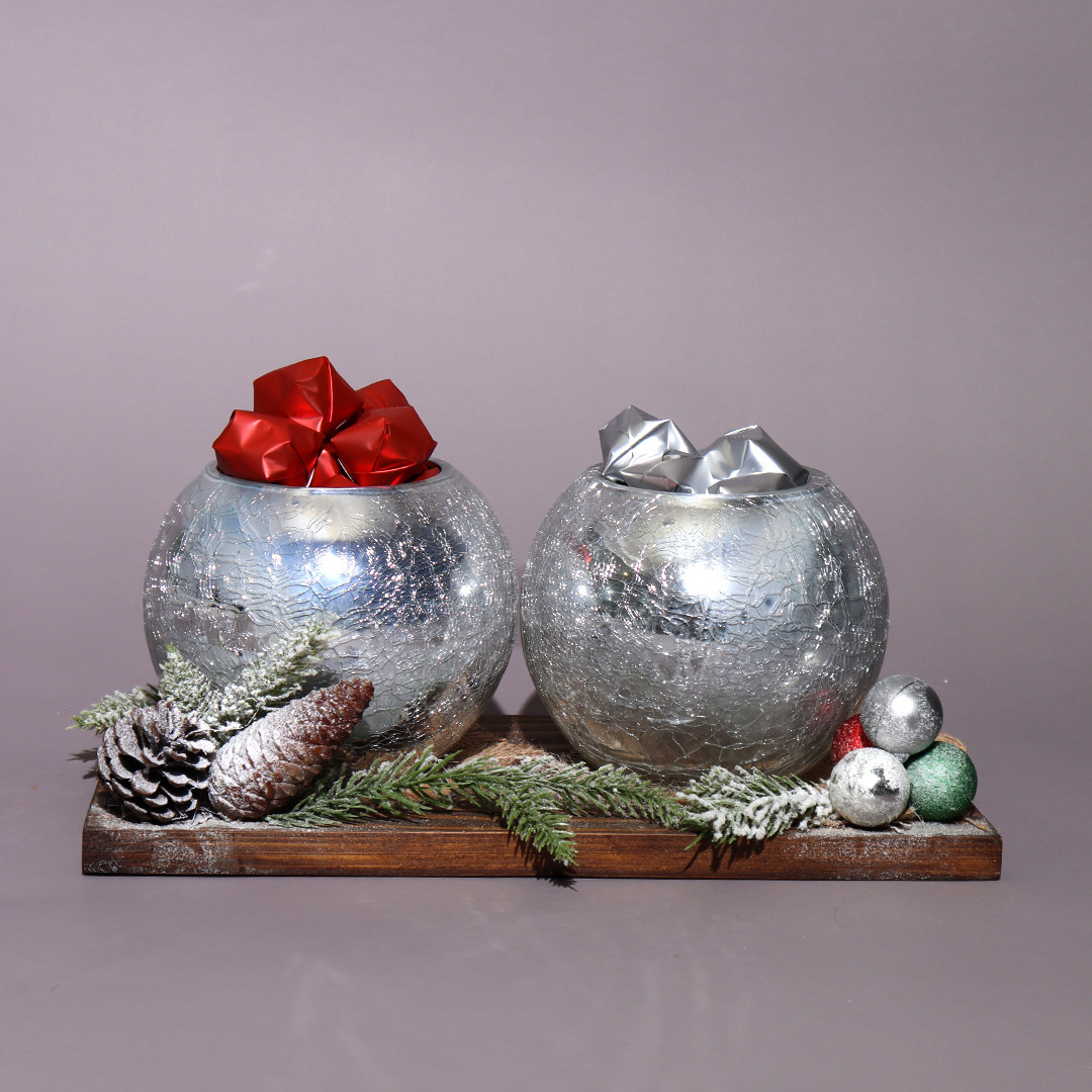 USD30 – USD50Price range: USD30 through USD50A curvy glass plate filled with 100% premium Belgian chocolate, complemented by Christmas decorations and festive accents. -