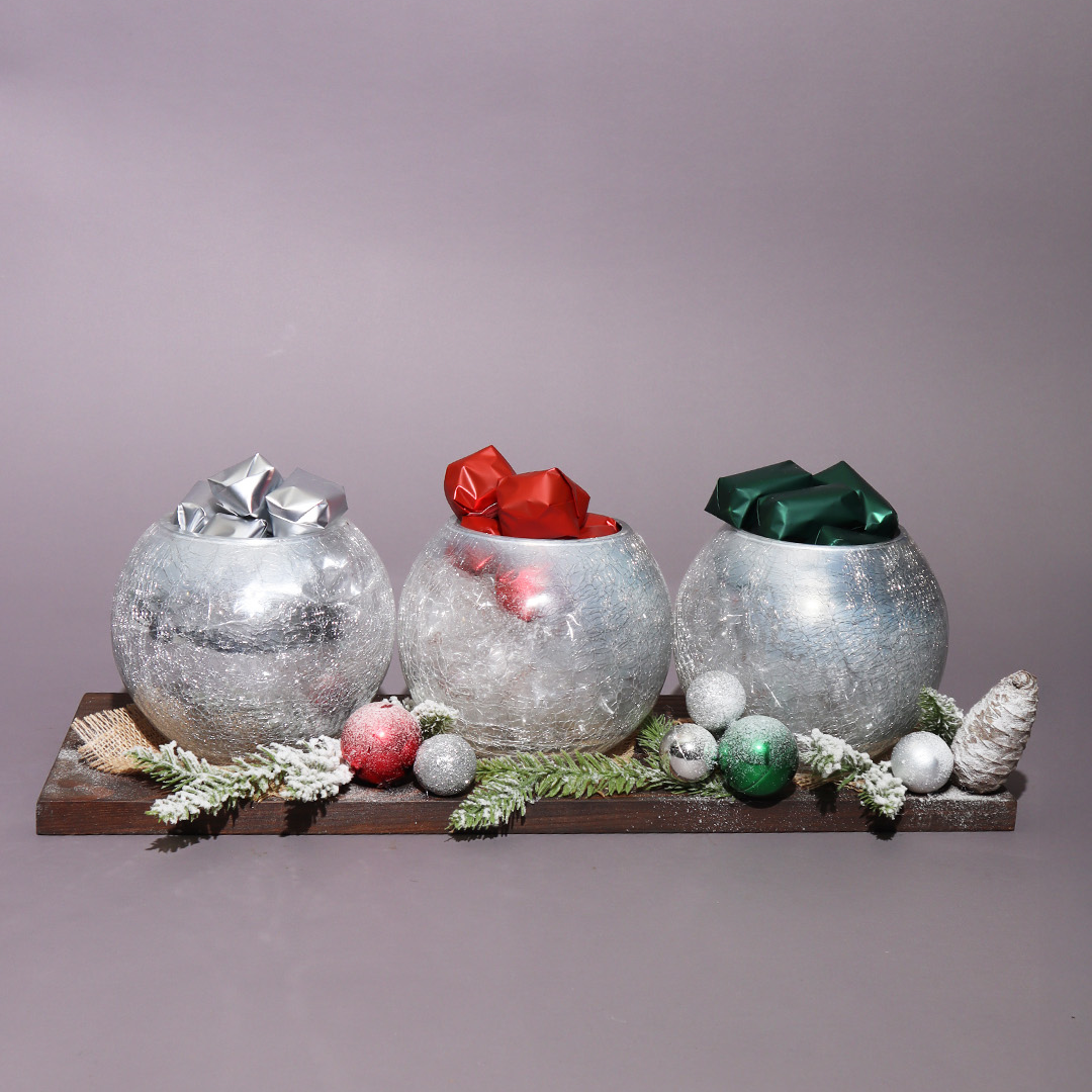 USD110A festive glass platter filled with 1.1 KG of 100% premium Belgian chocolate, complemented by Christmas decorations, perfect for holiday celebrations. -