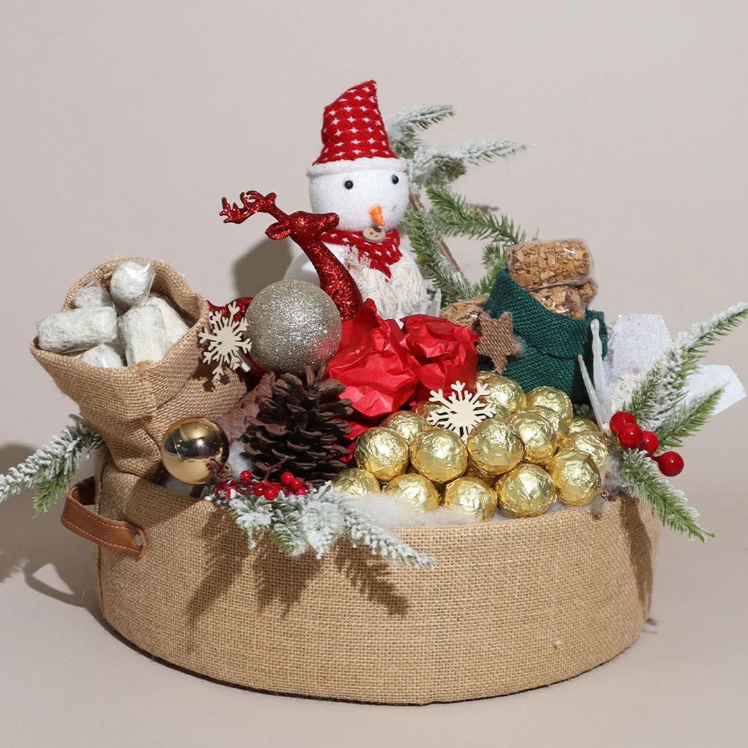 A large Christmas burlap tray containing 1.65 KG of 100% premium Belgian chocolate, decorated with festive holiday ornaments.