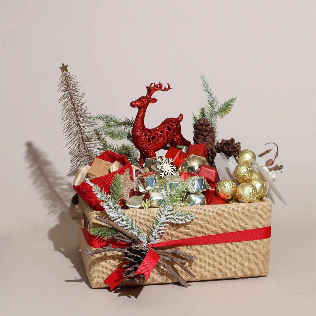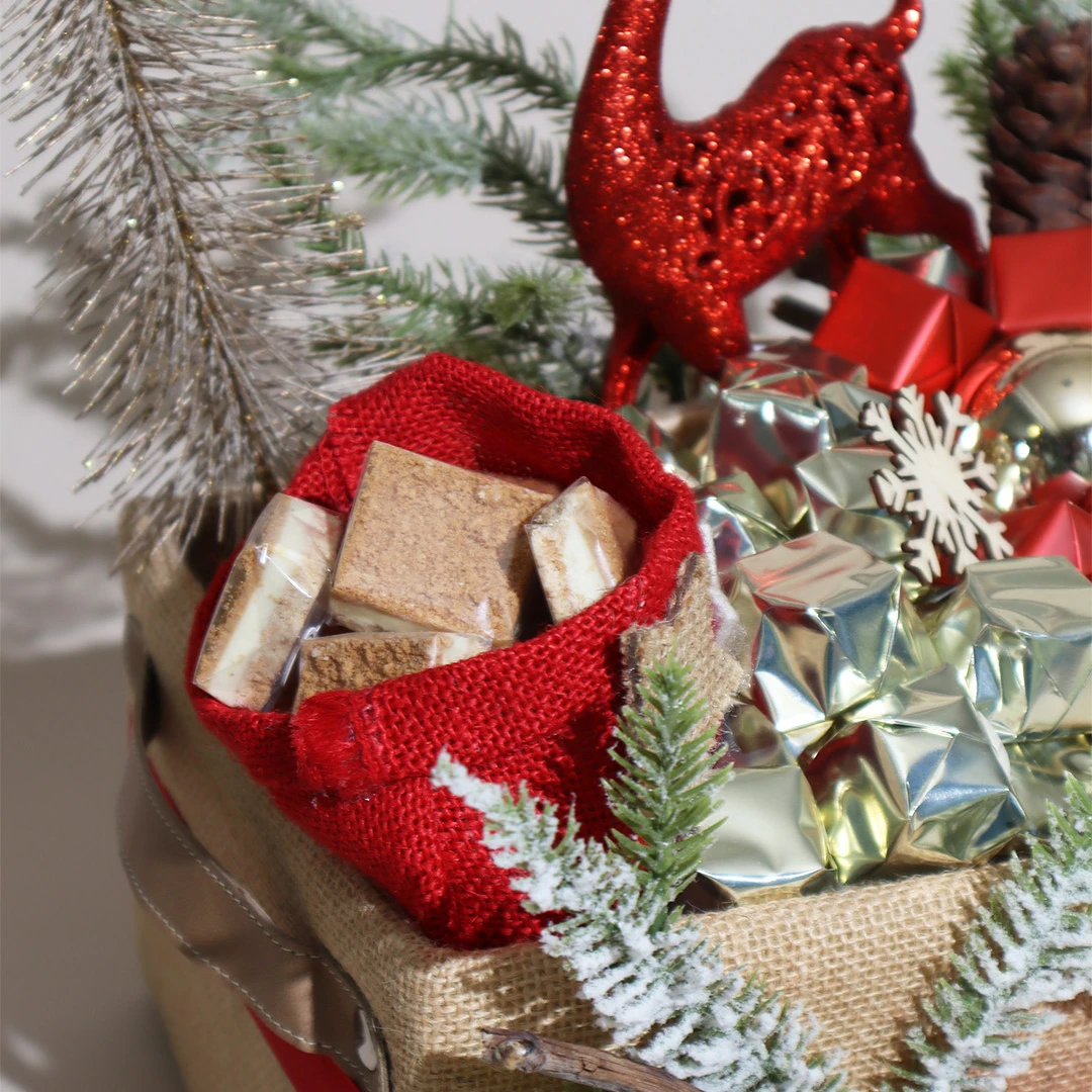 A Christmas burlap basket holding 1 KG of 100% premium Belgian chocolate, decorated with festive holiday ornaments.
