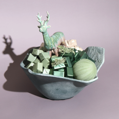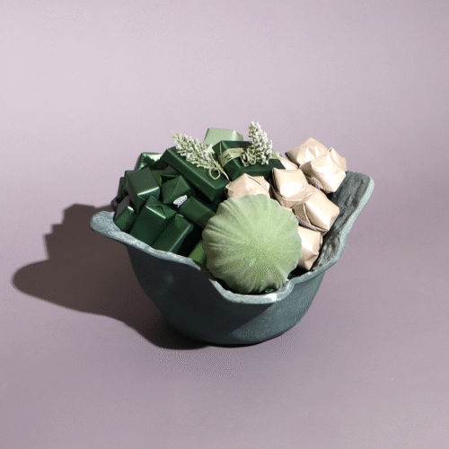 USD150A hand-painted, metallic footed bowl filled with 1.2 KG of 100% premium Belgian chocolate. -