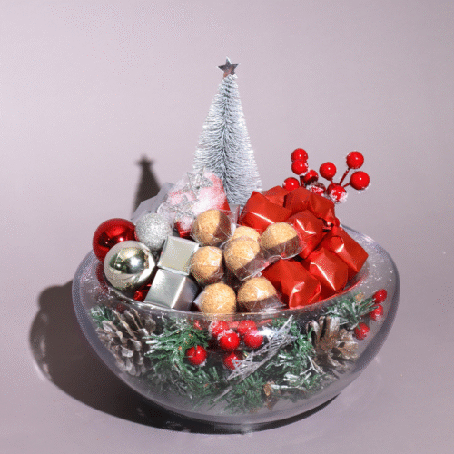 USD110A festive glass platter filled with 1.1 KG of 100% premium Belgian chocolate, complemented by Christmas decorations, perfect for holiday celebrations.