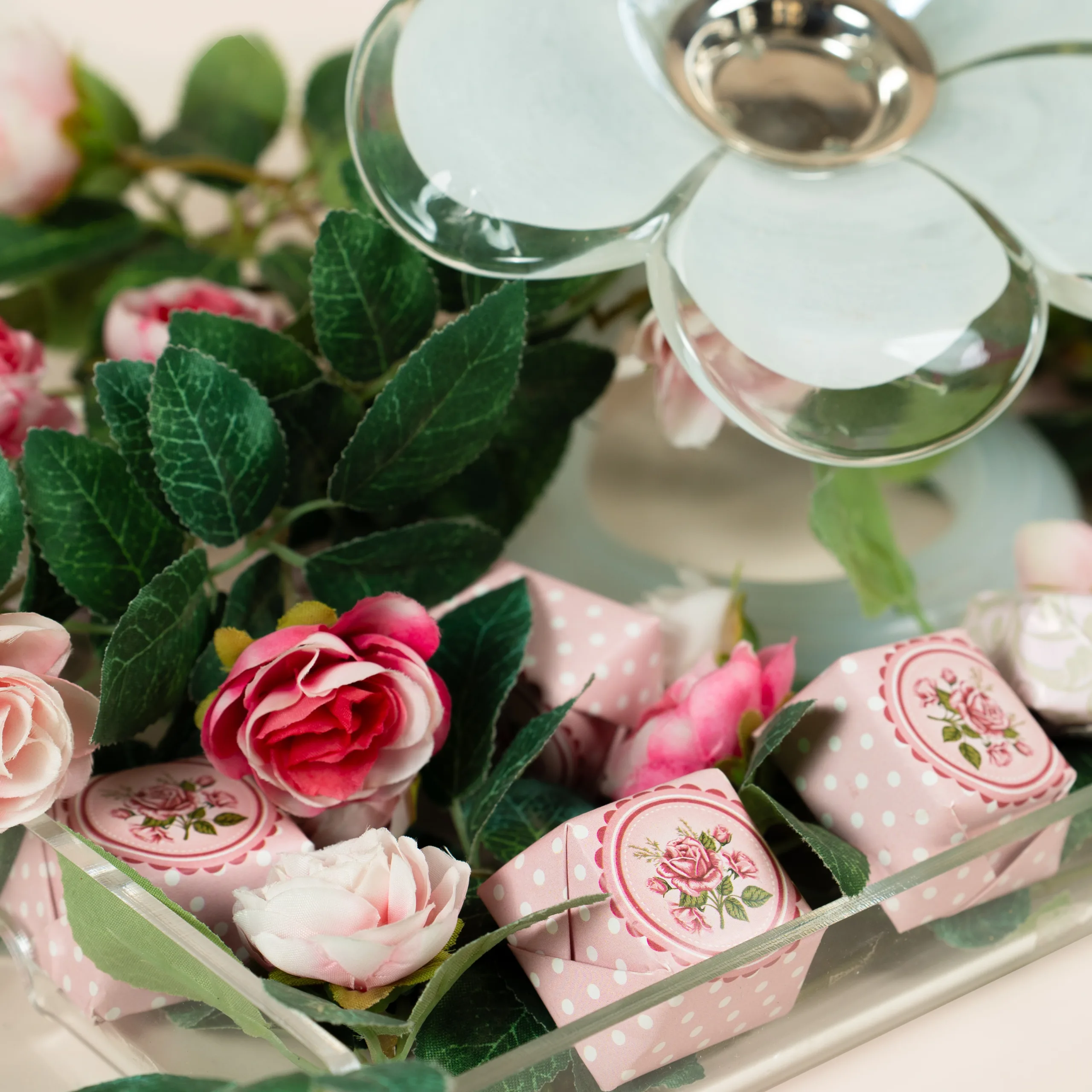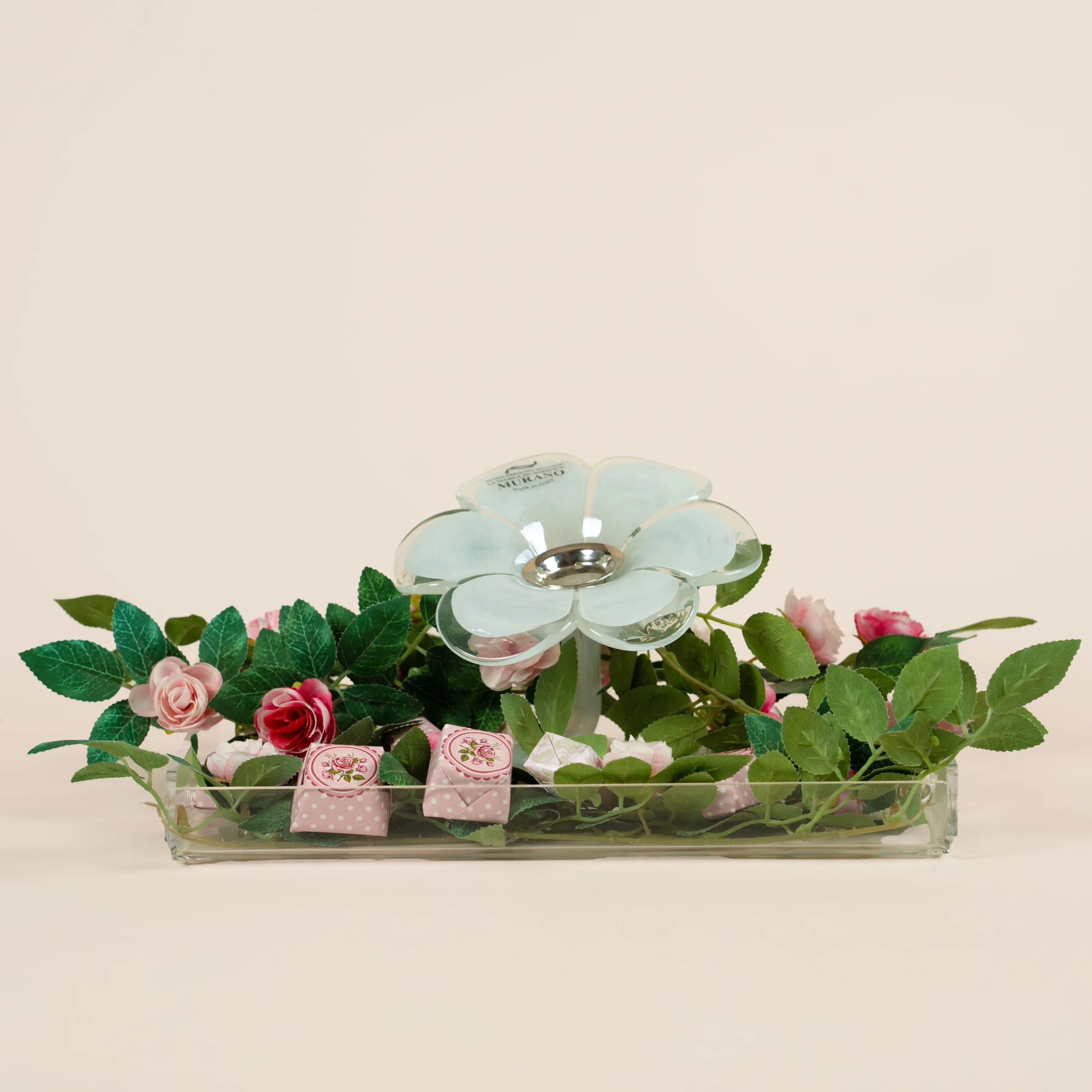 A flower-shaped Murano incense burner on an acyrlic tray with 120 grams of 100% premium Belgian chocolate.