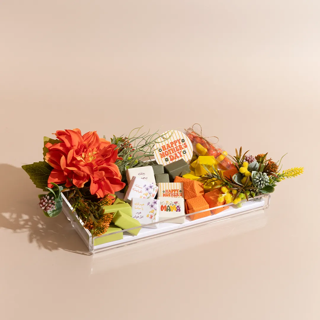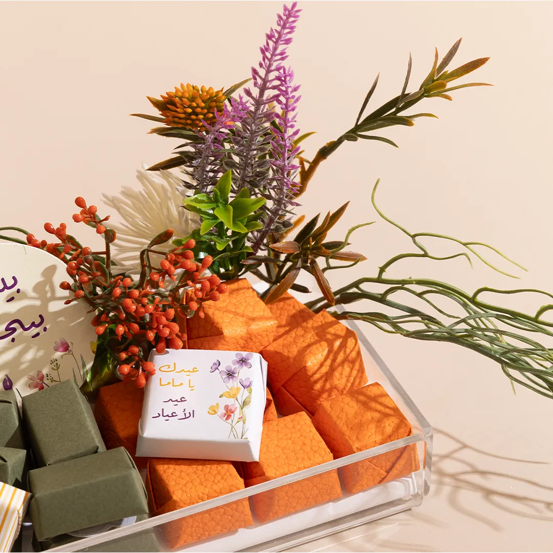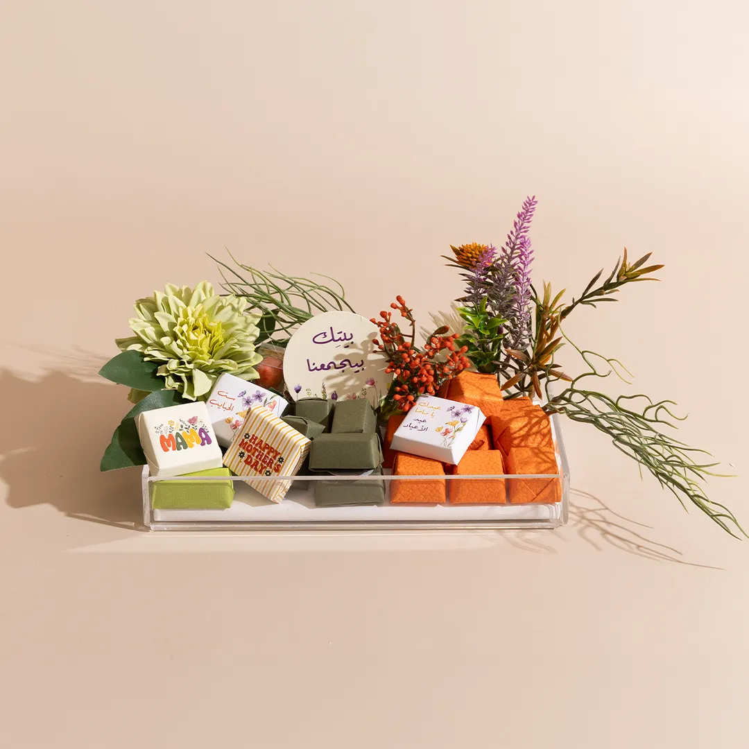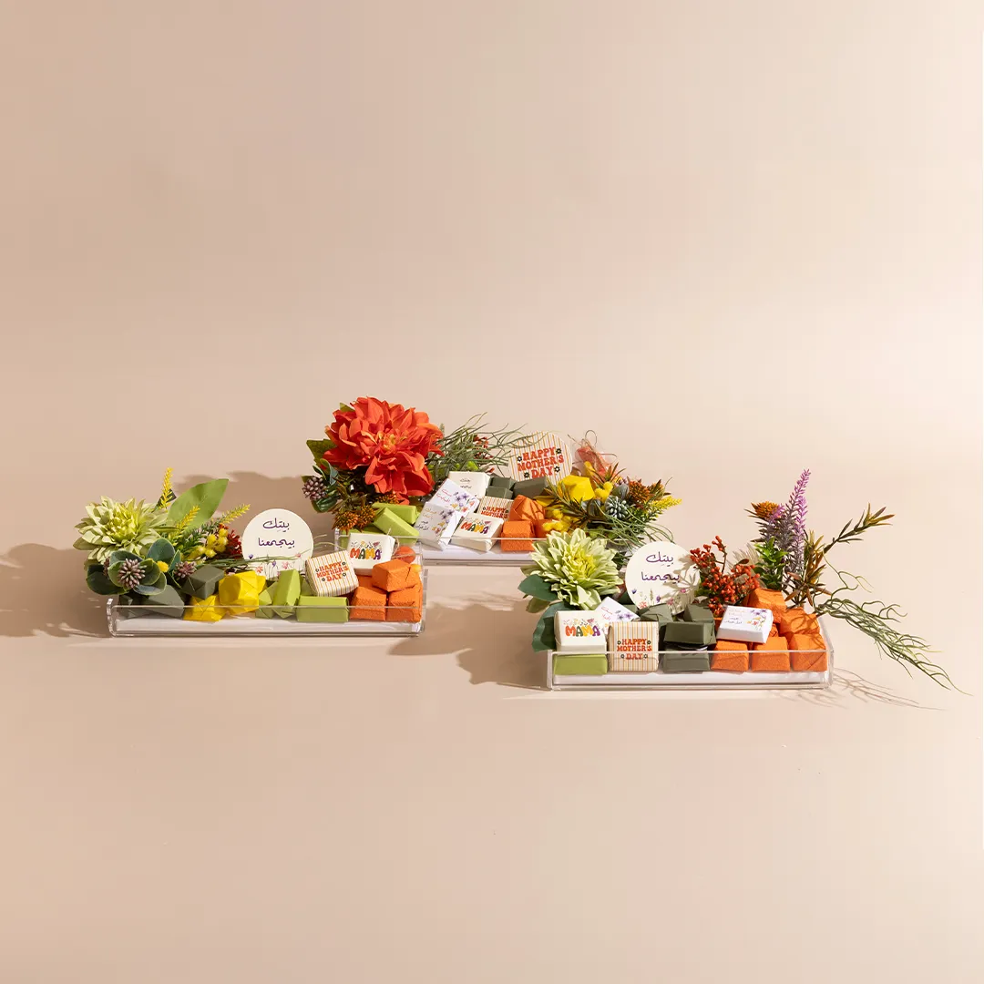 A floral acrylic tray in three sizes, showcasing 400 g, 460 g, and 650 g of premium Belgian chocolates and fruit-coated chocolate dragées