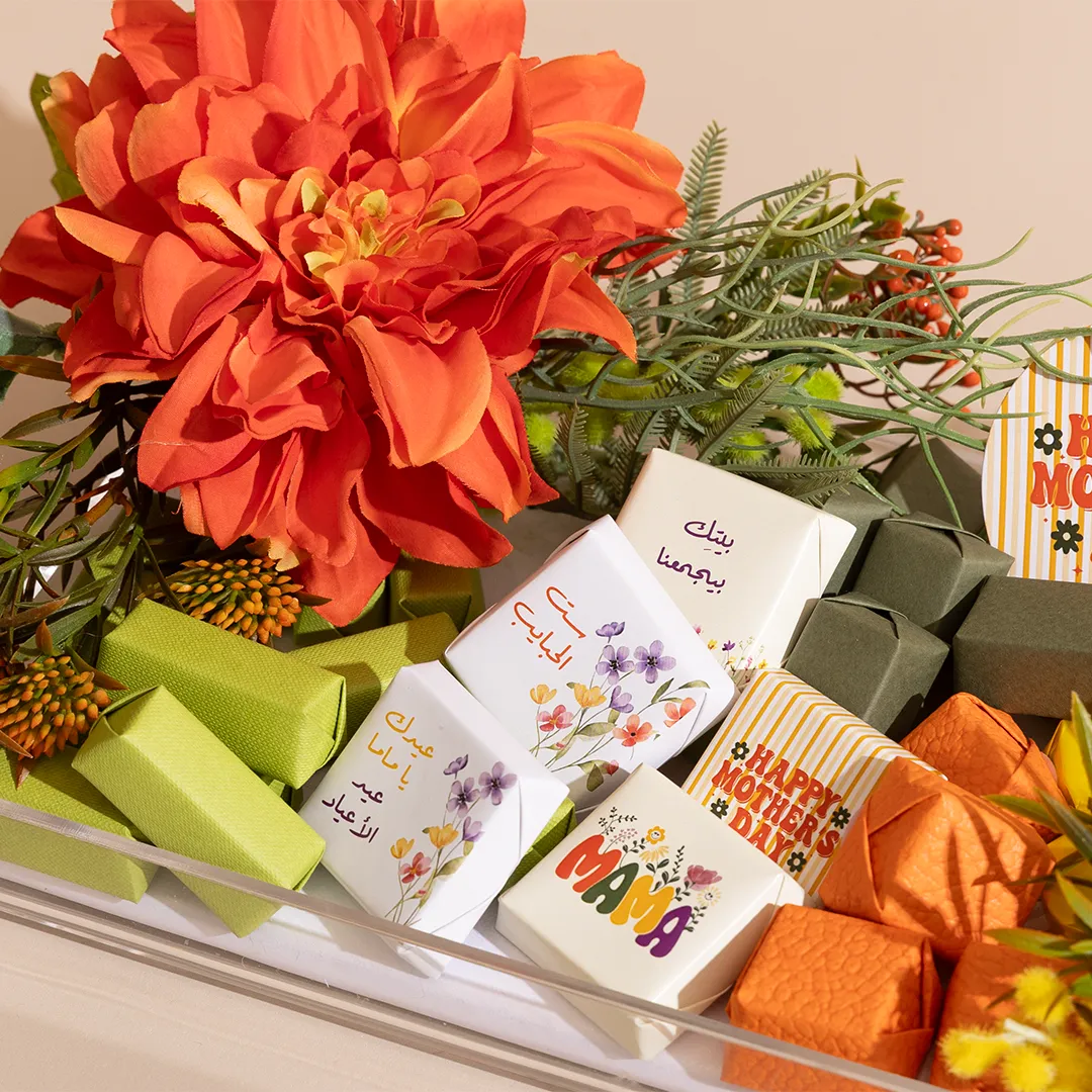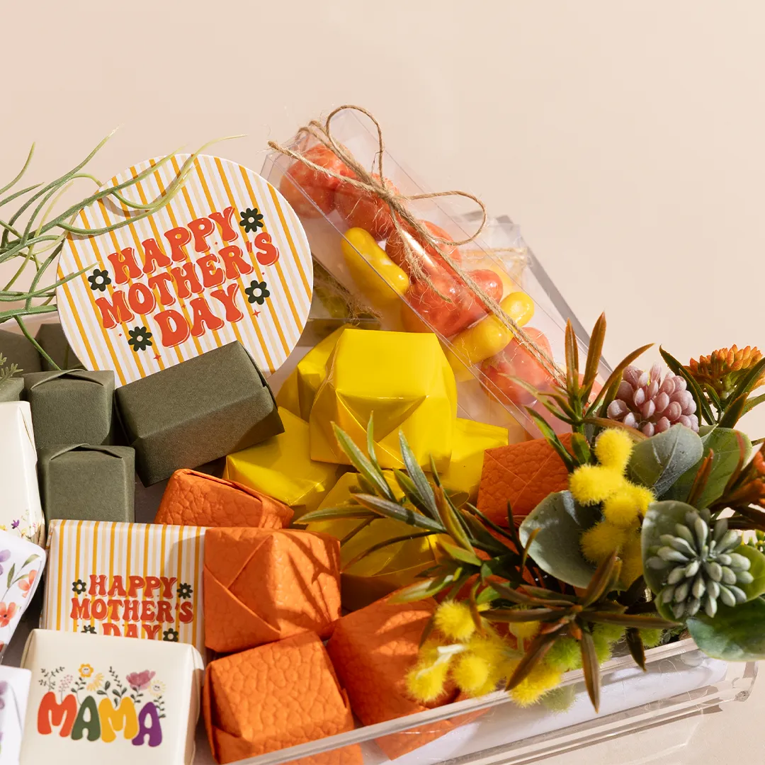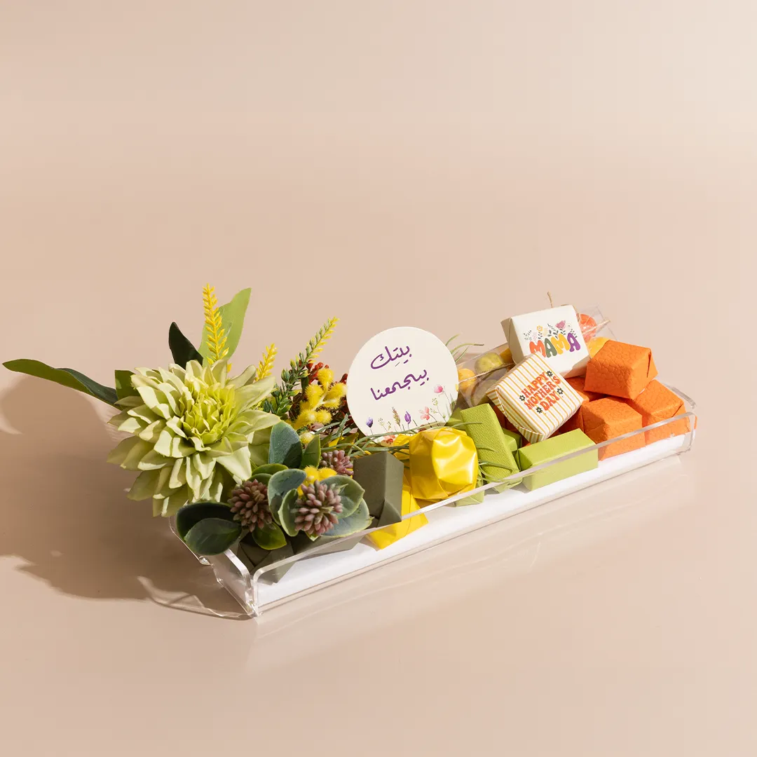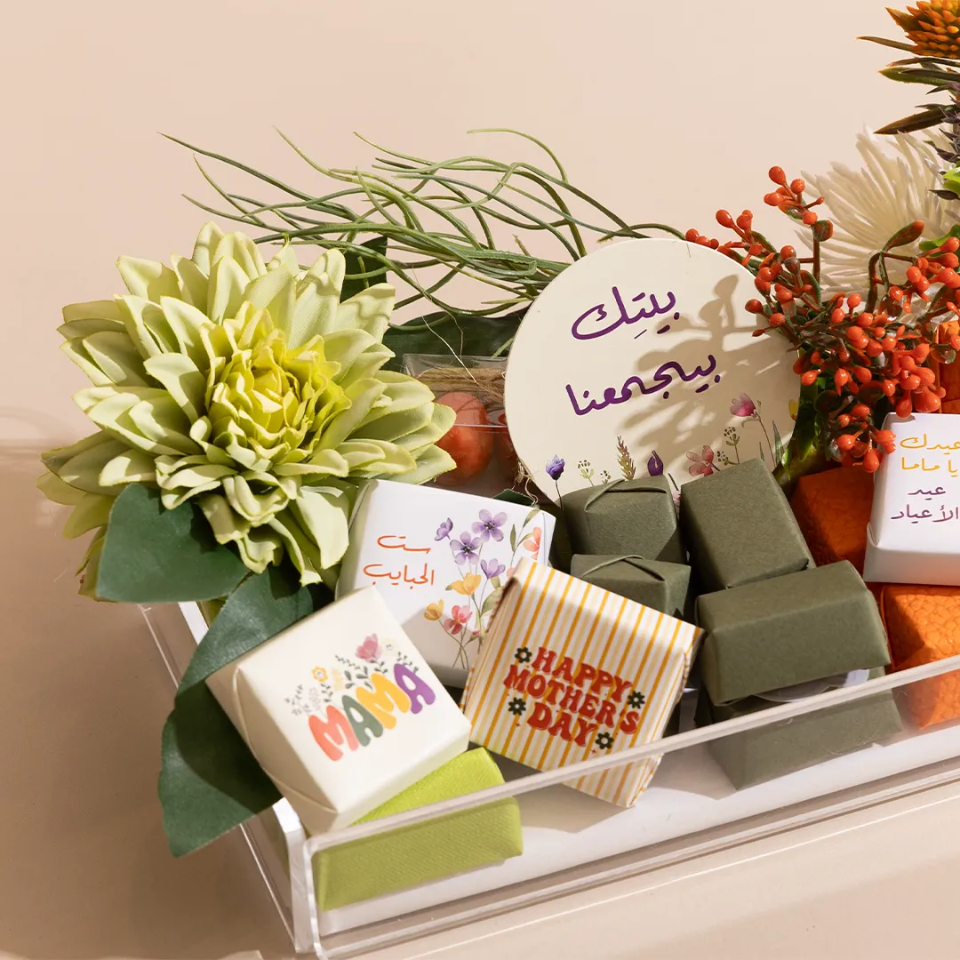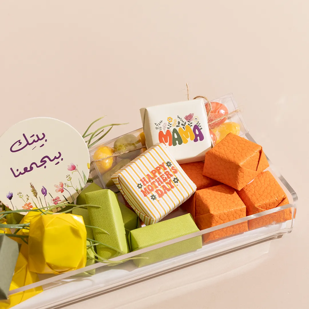 A floral acrylic tray in three sizes, showcasing 400 g, 460 g, and 650 g of premium Belgian chocolates and fruit-coated chocolate dragées