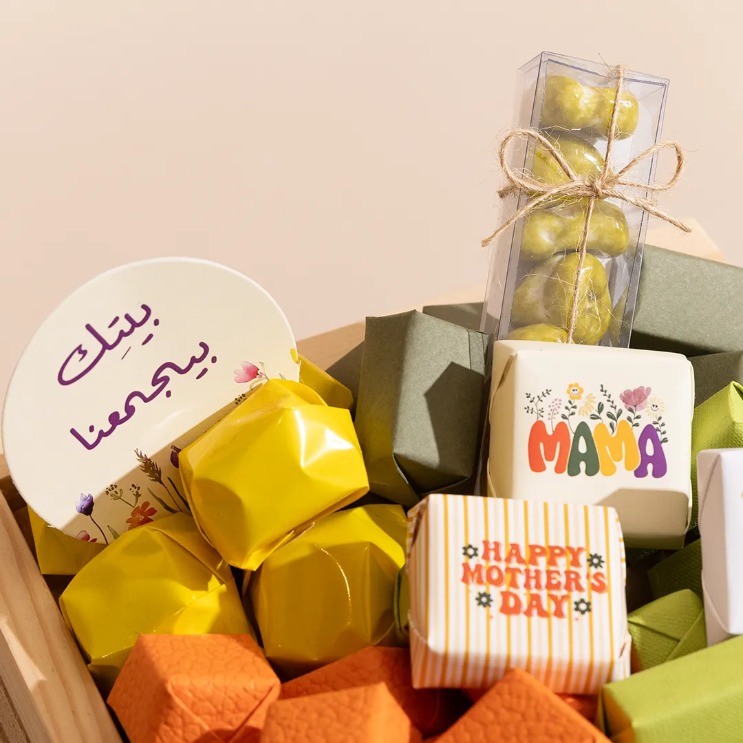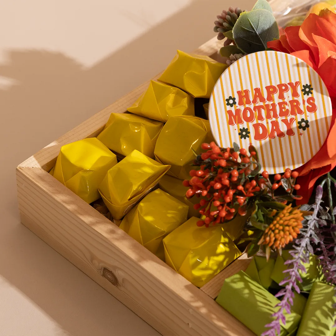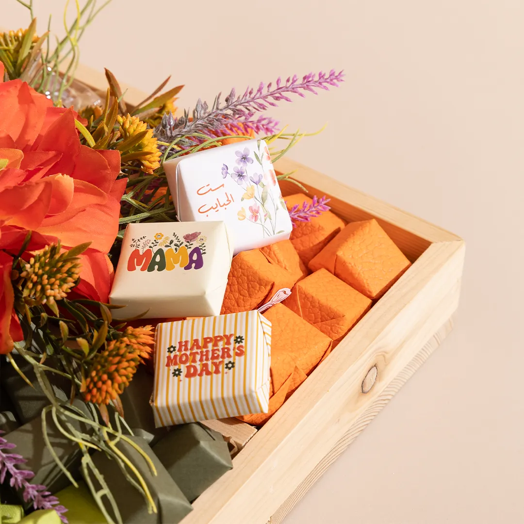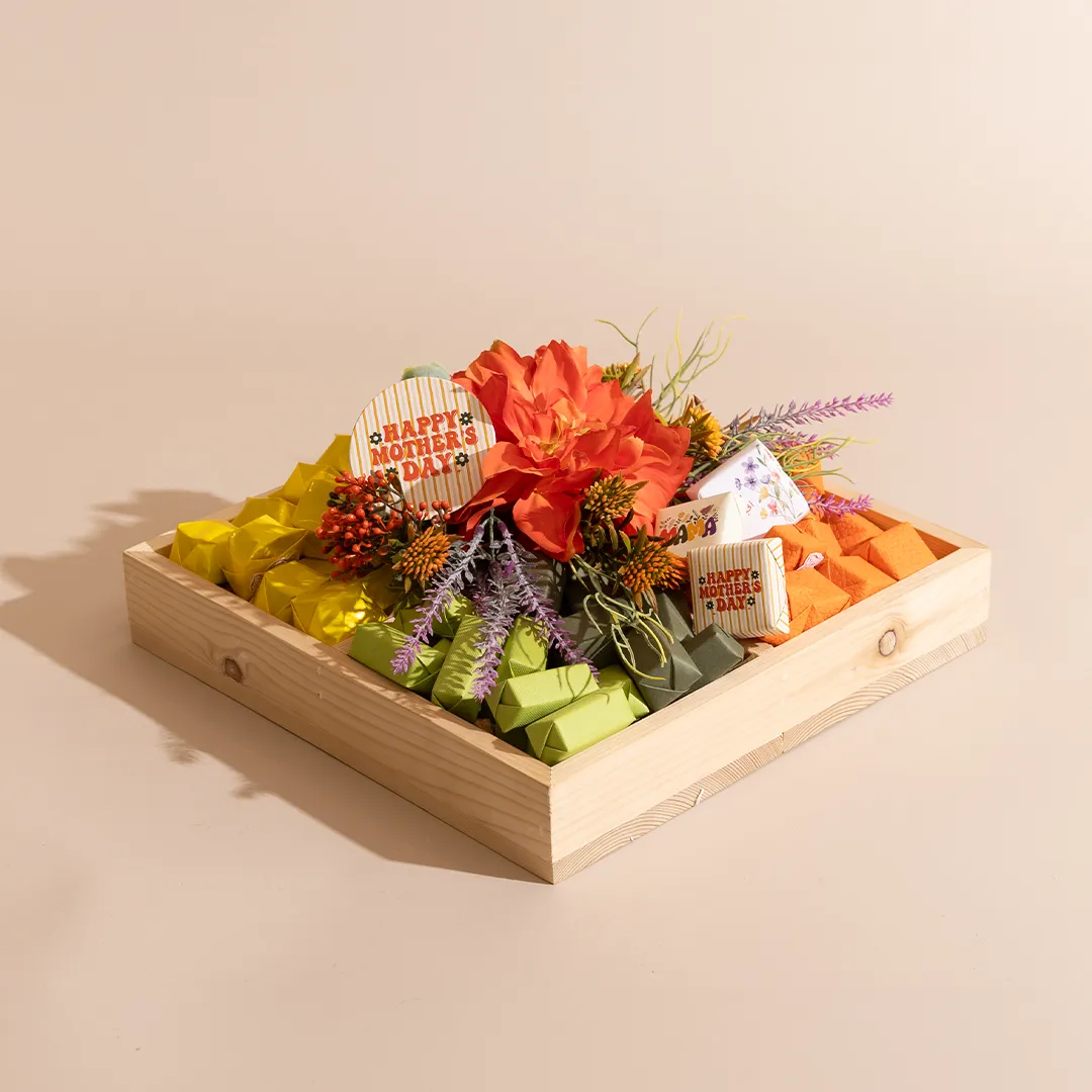 A floral wooden tray in two sizes, showcasing 1 kg and 1.4 kg of premium Belgian chocolates and fruit-coated chocolate dragées
