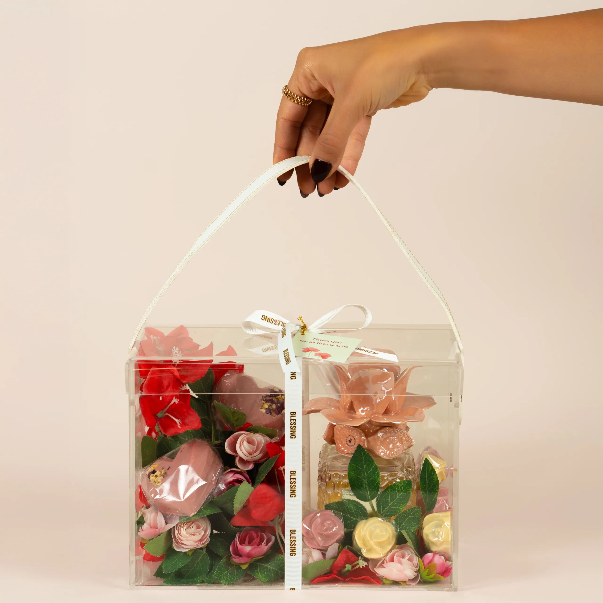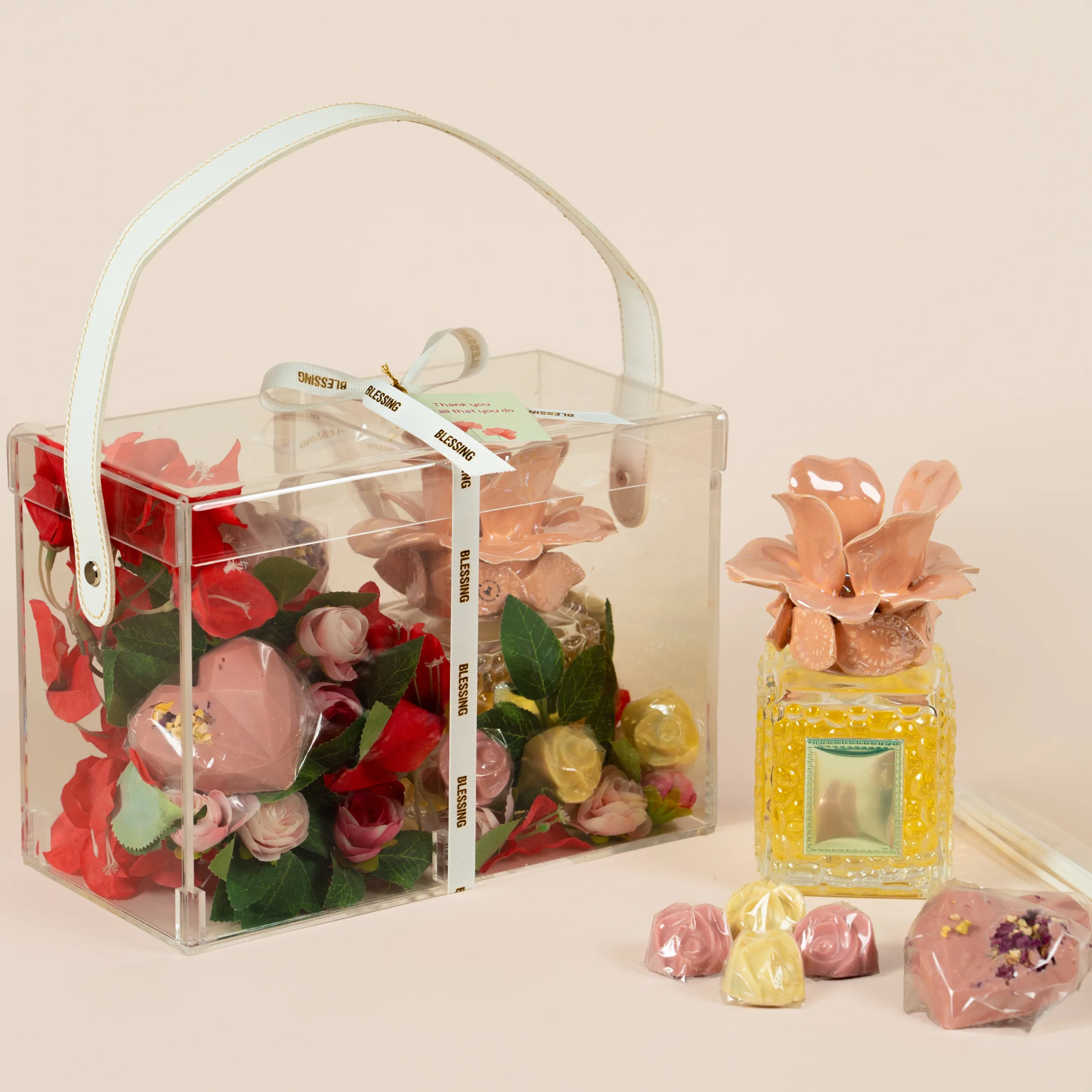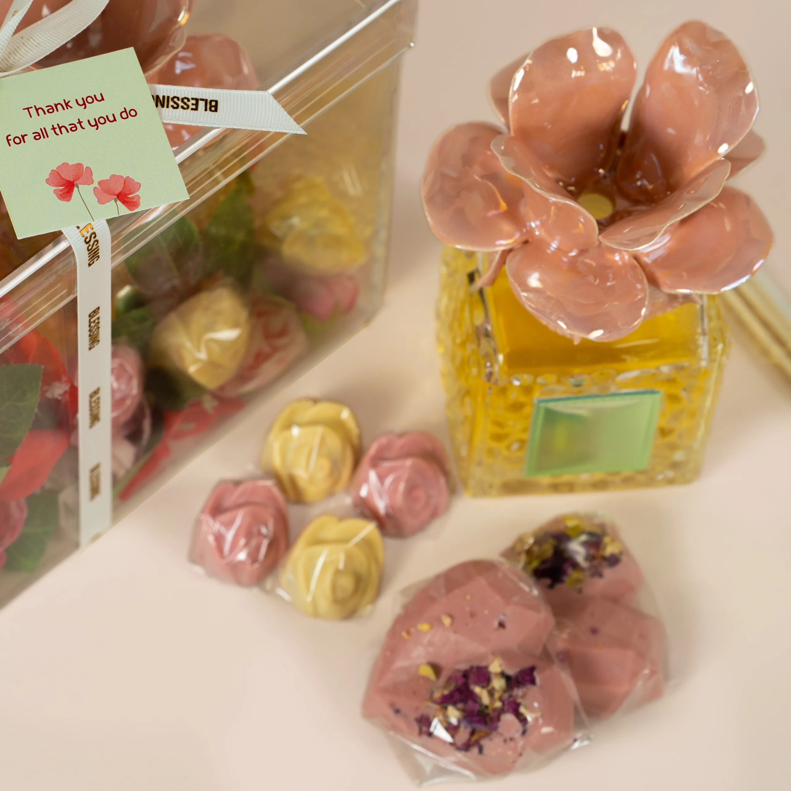 A floral Murano glass diffuser with sticks and 180 grams of 100% premium Belgian chocolate in a decorated acyrlic box with a leather handle.