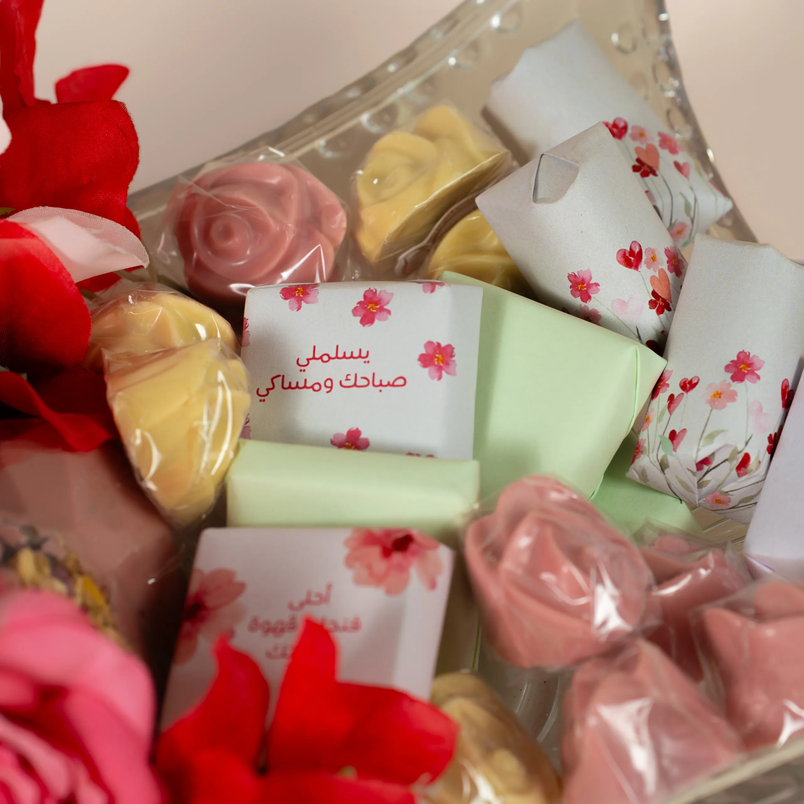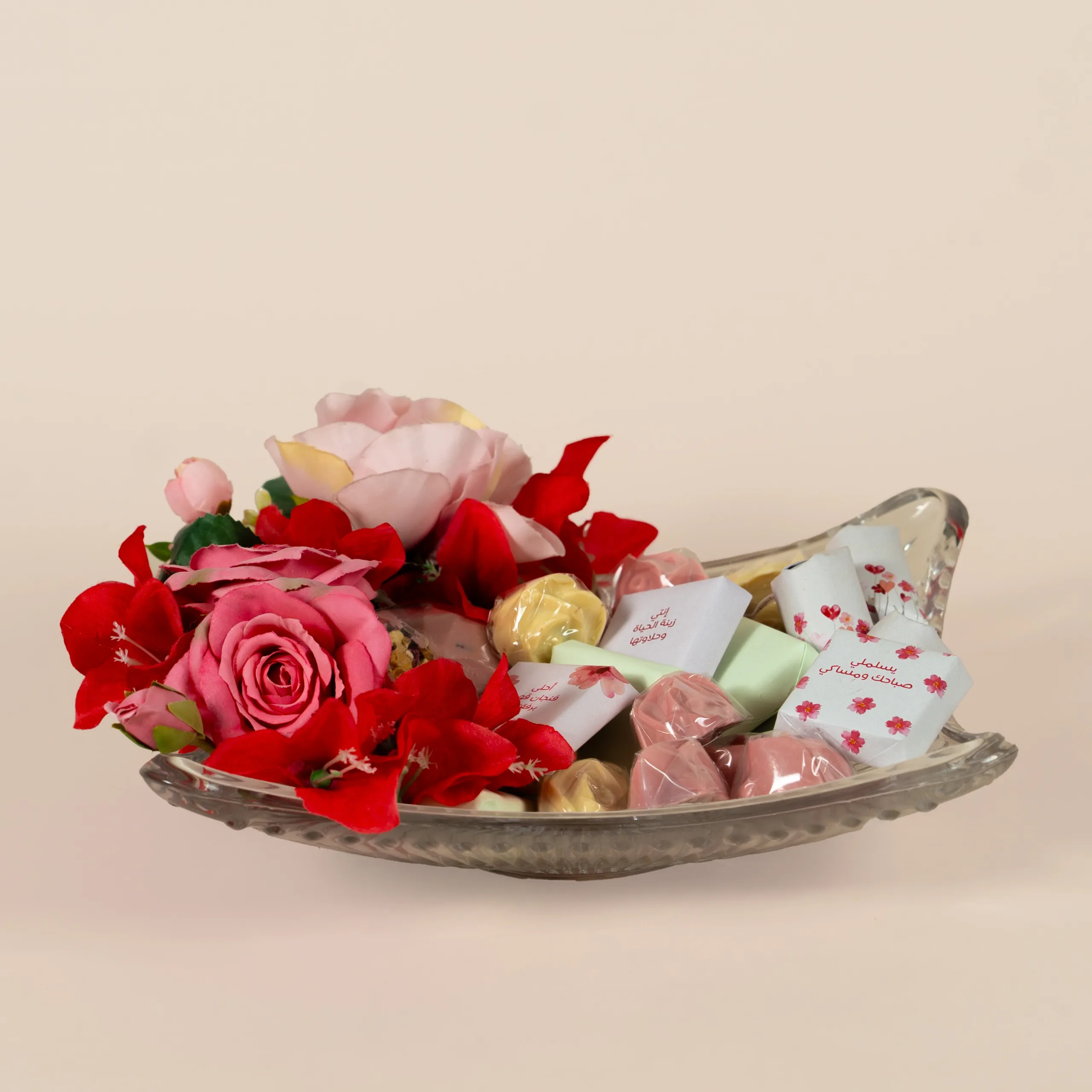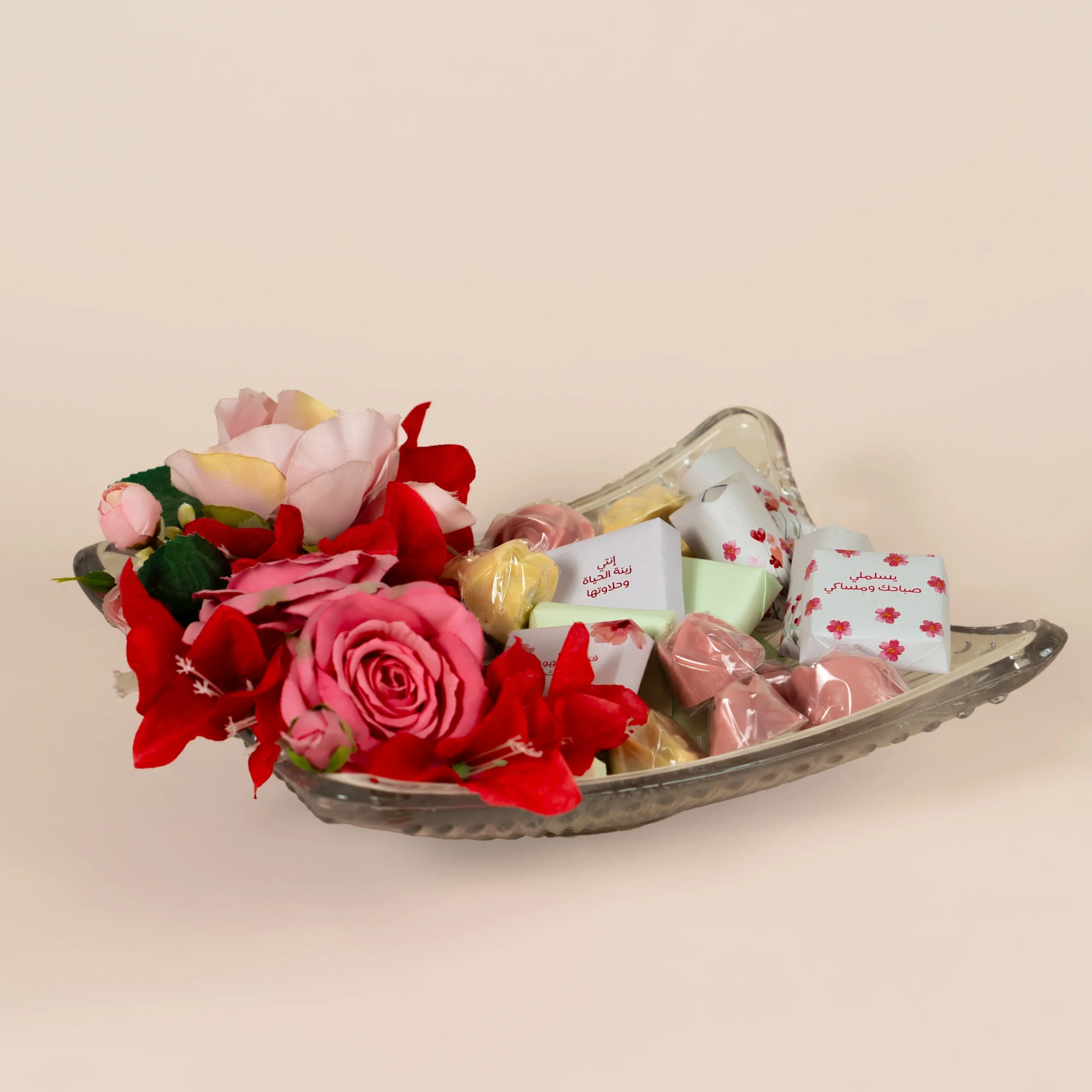 A glass plate featuring 380 grams of 100% premium Belgian chocolate and floral accents.