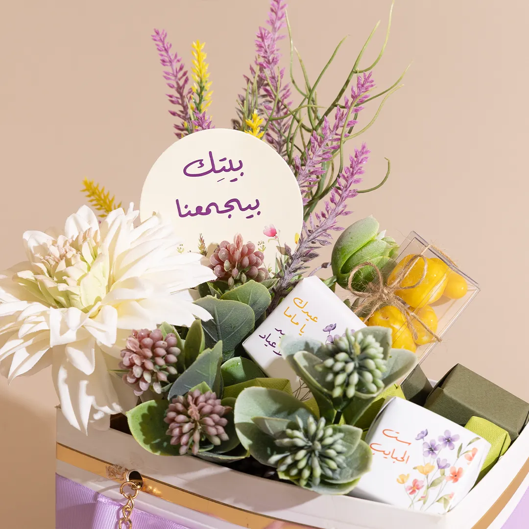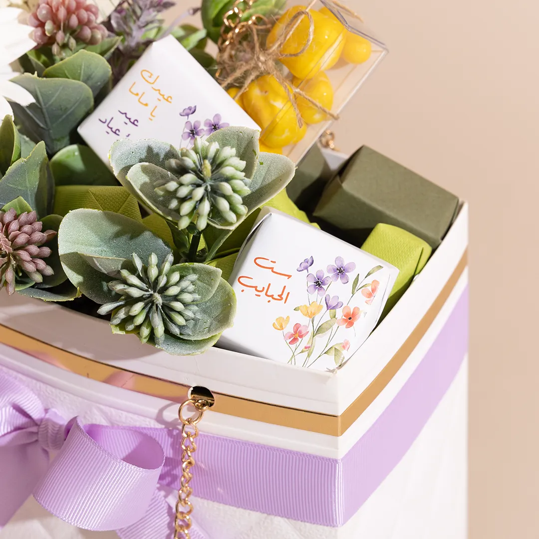 A decorated white handbag-style box, accented with golden chains, showcasing 270 g of premium Belgian chocolates and fruit-coated chocolate dragées