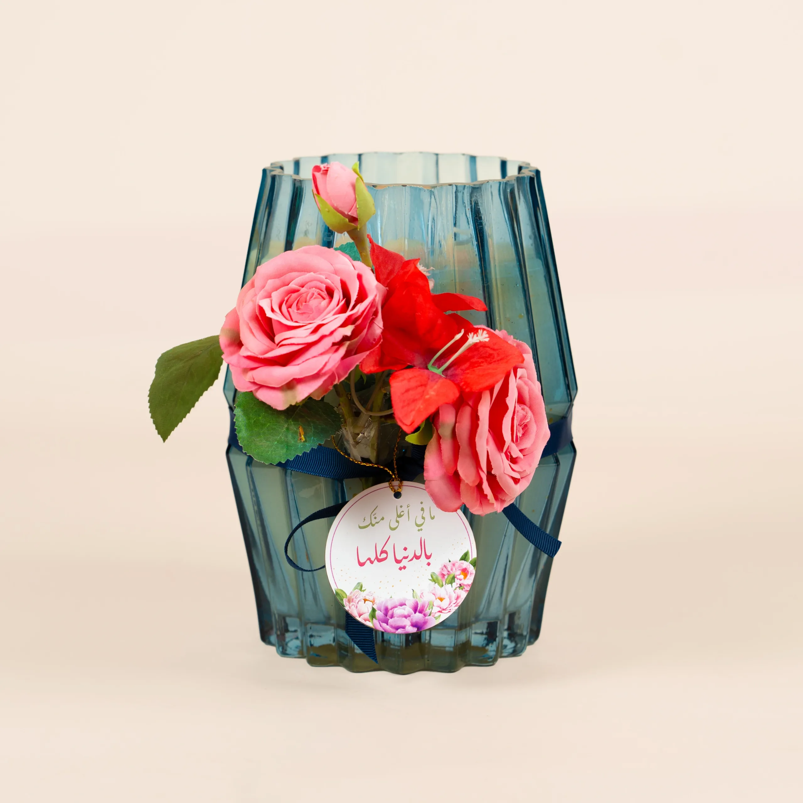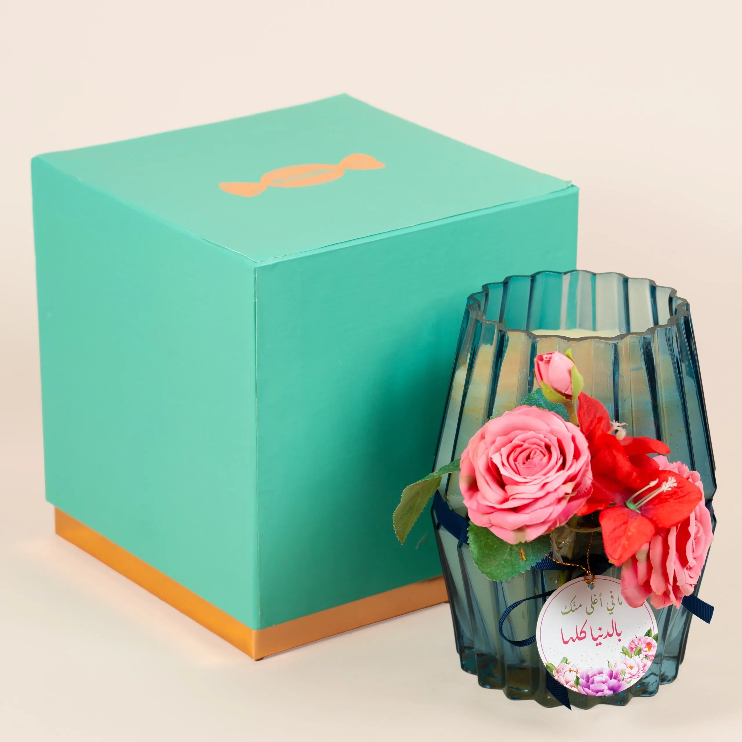 A ribbed, navy blue glass candle with floral decorations and a sweet note.