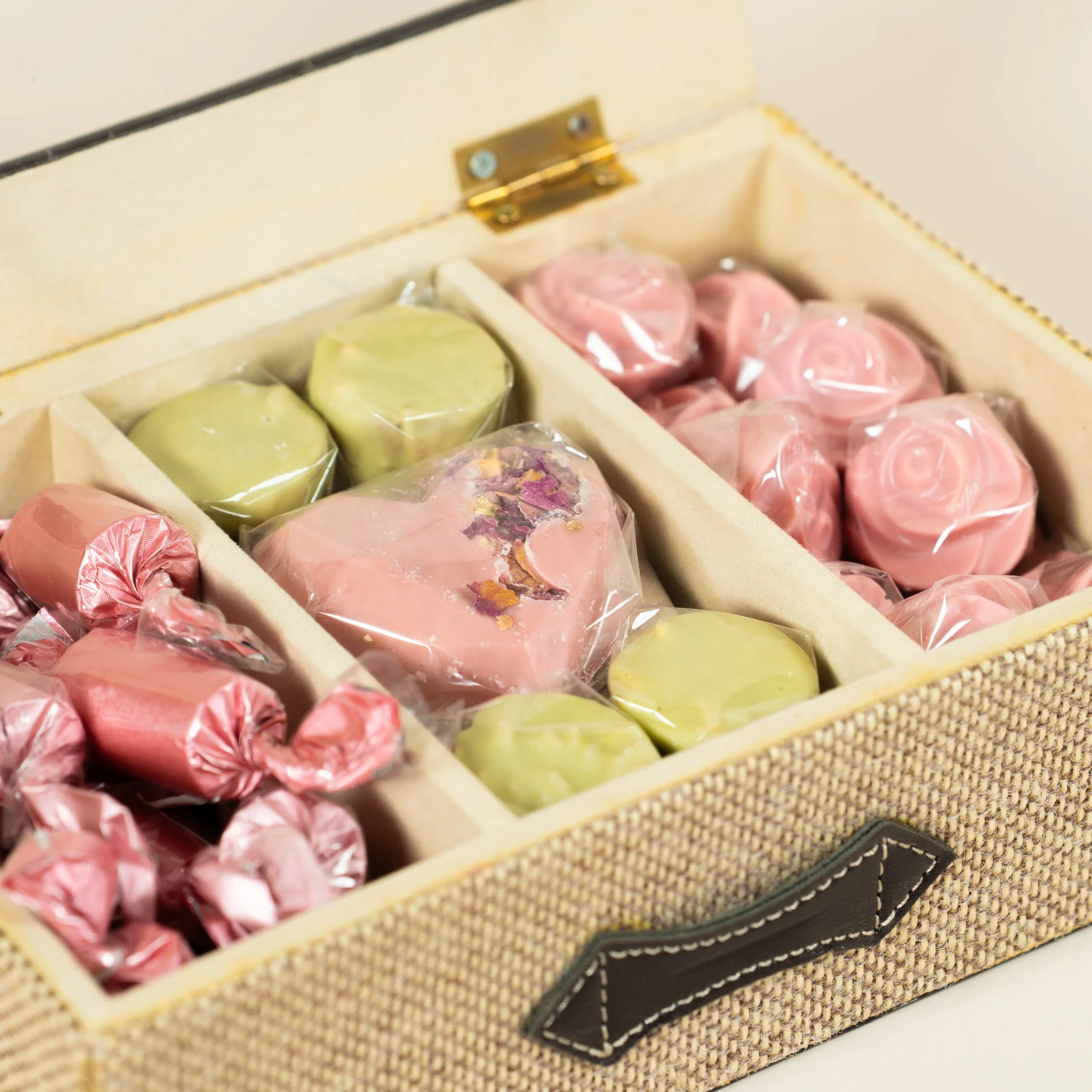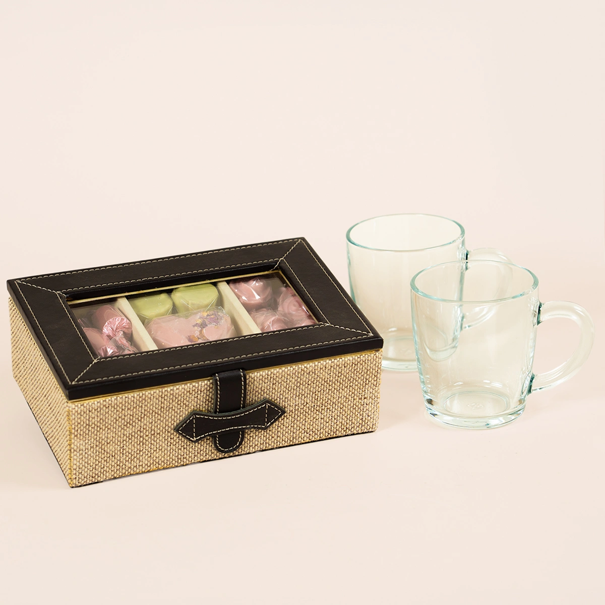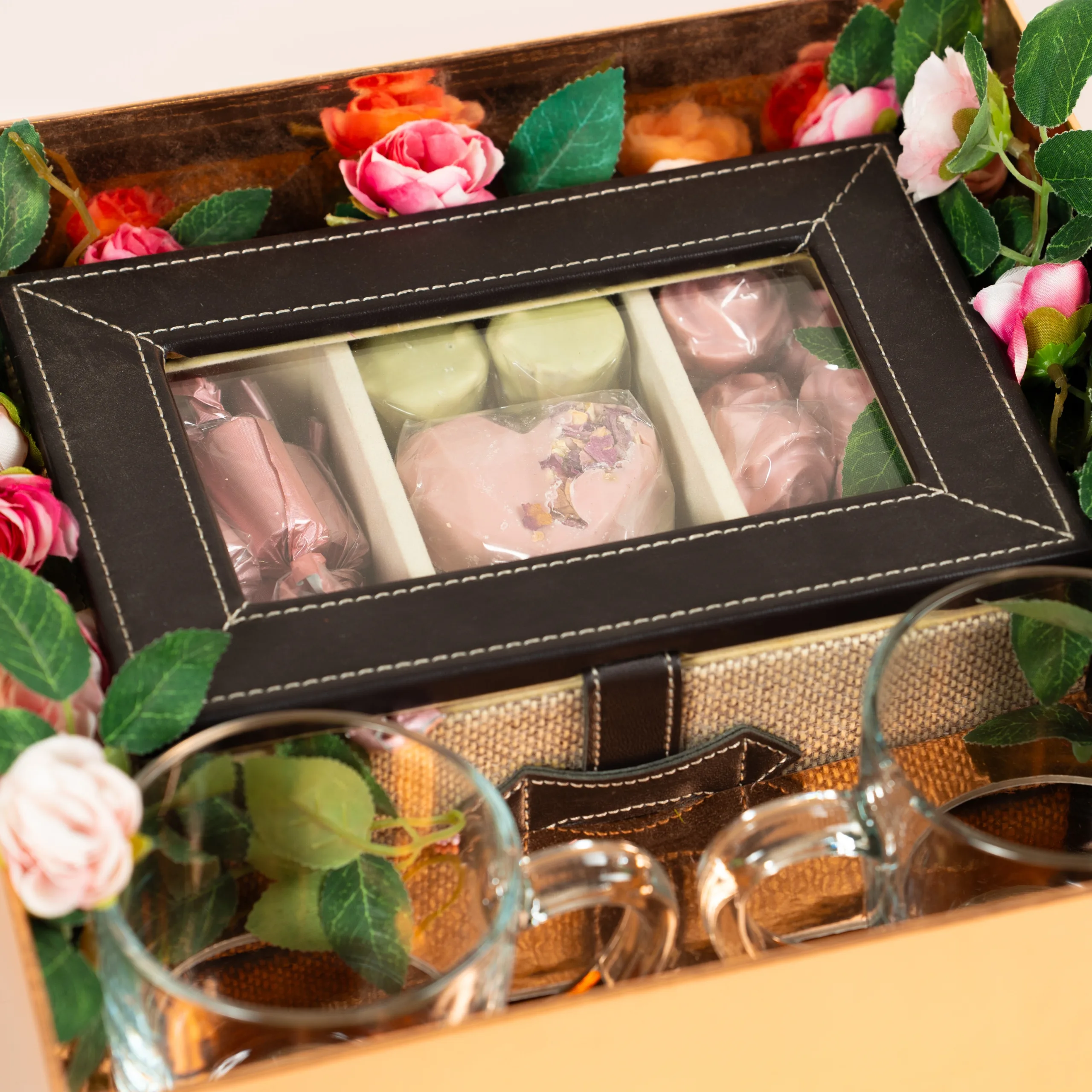 A leather tea box with 280 grams of 100% premium Belgian chocolate and 2 glass mugs, perfect for enjoying tea time with Mom.