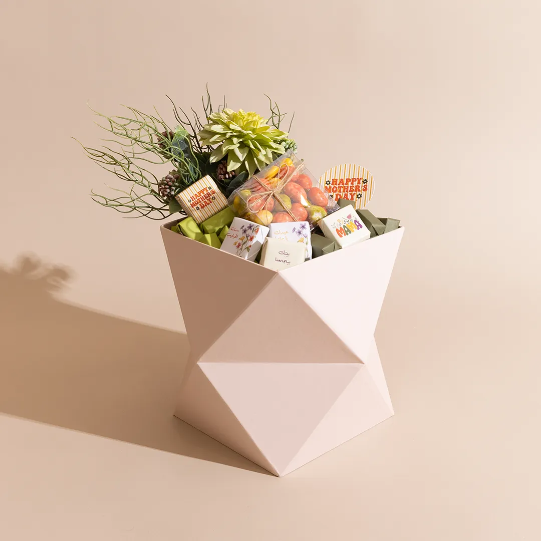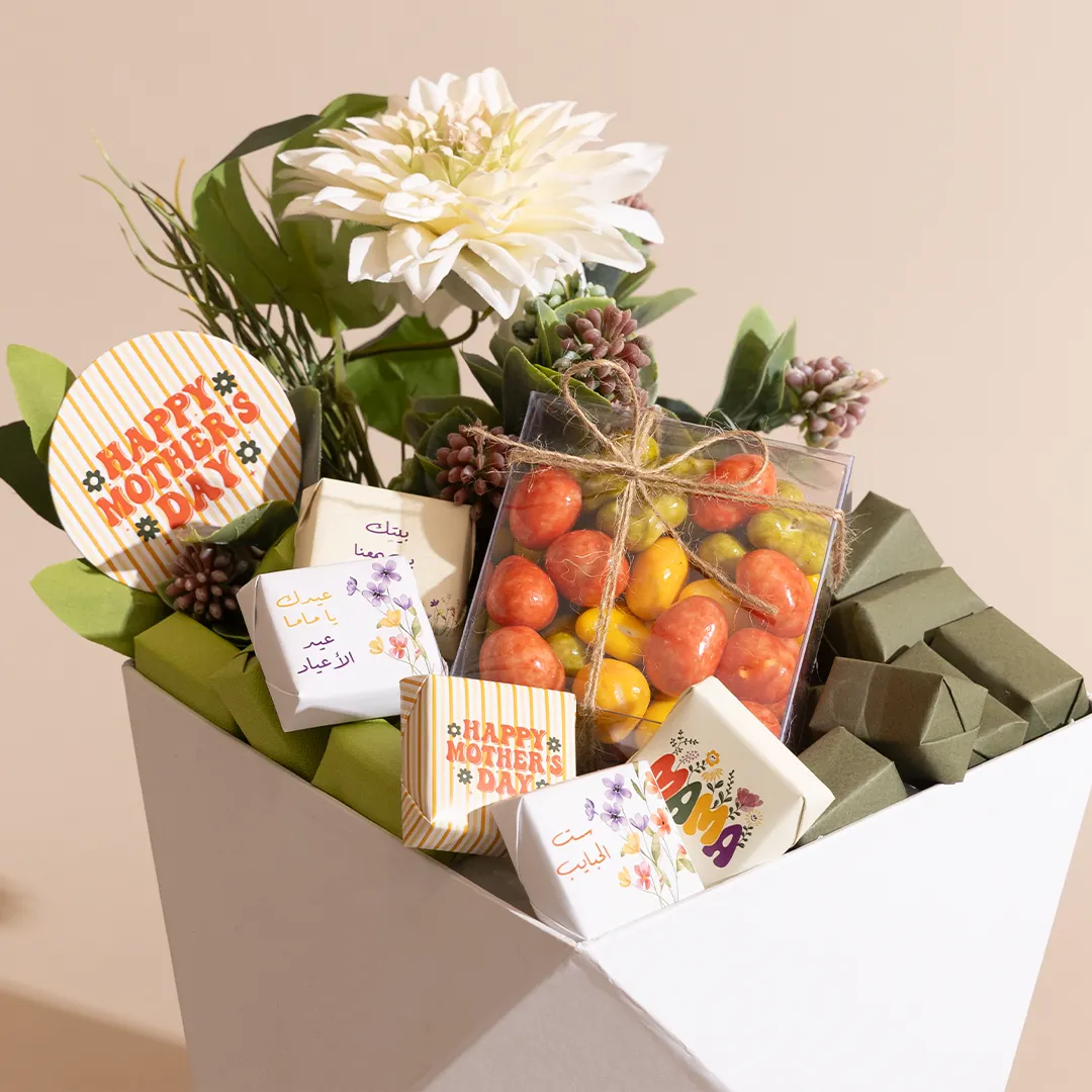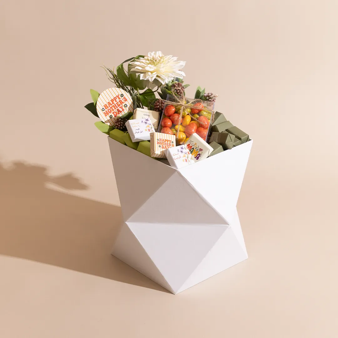 A modern, geometric box holding 700 g of premium Belgian chocolate and fruit-coated chocolate dragées