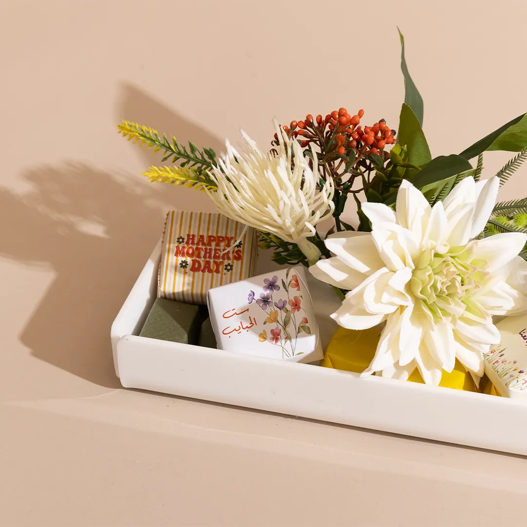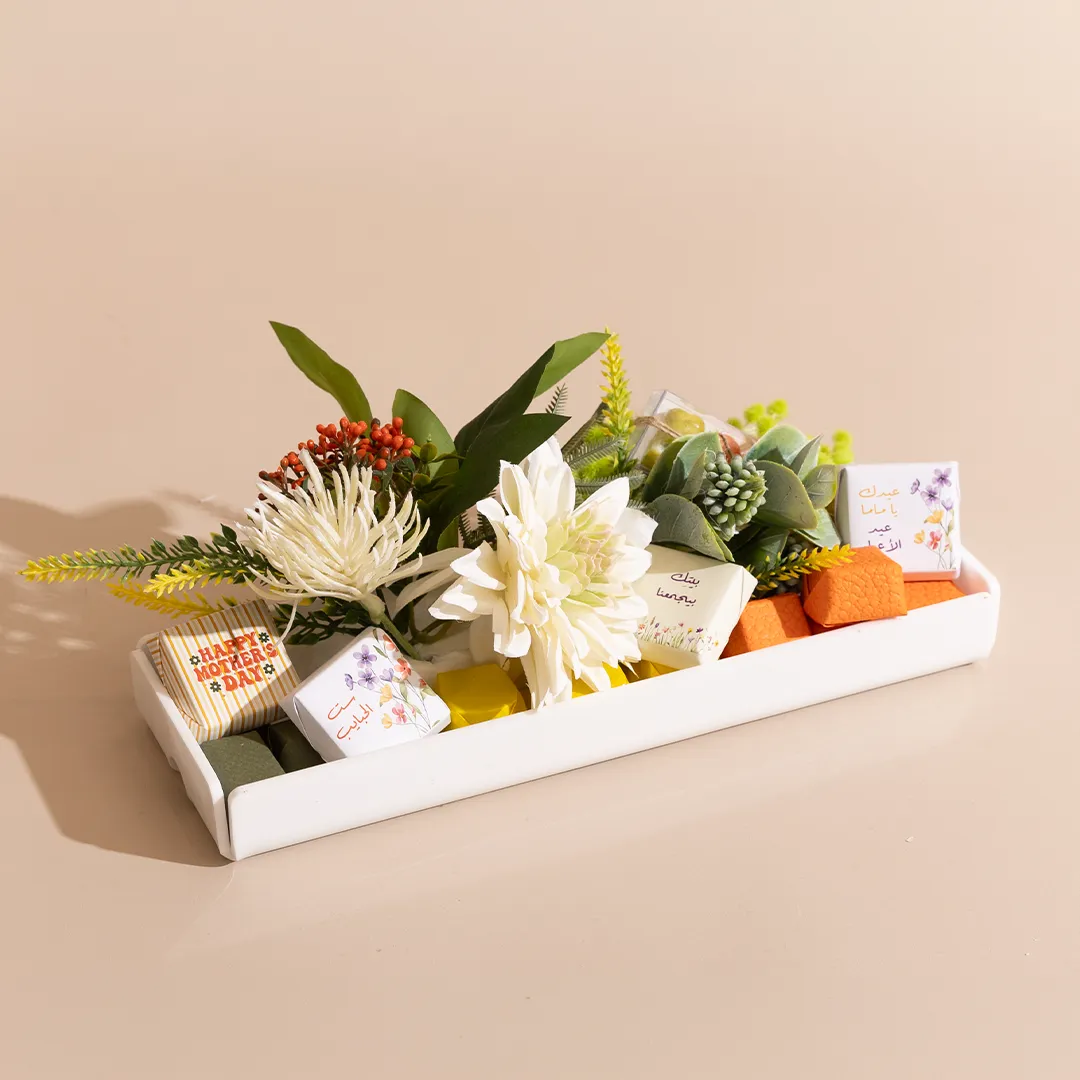 A floral white acrylic tray in two sizes, showcasing 300 g and 380 g of premium Belgian chocolates and fruit-coated chocolate dragées