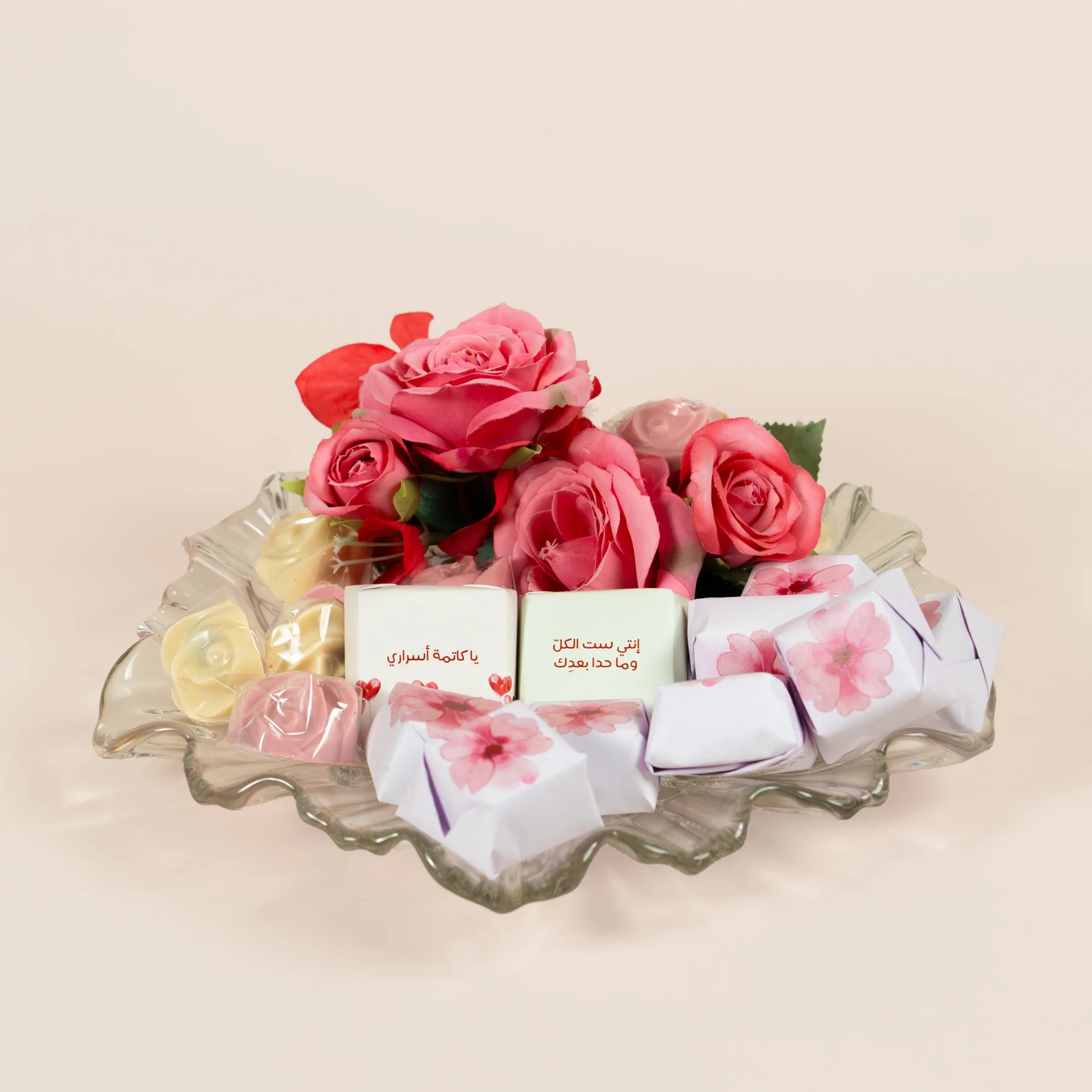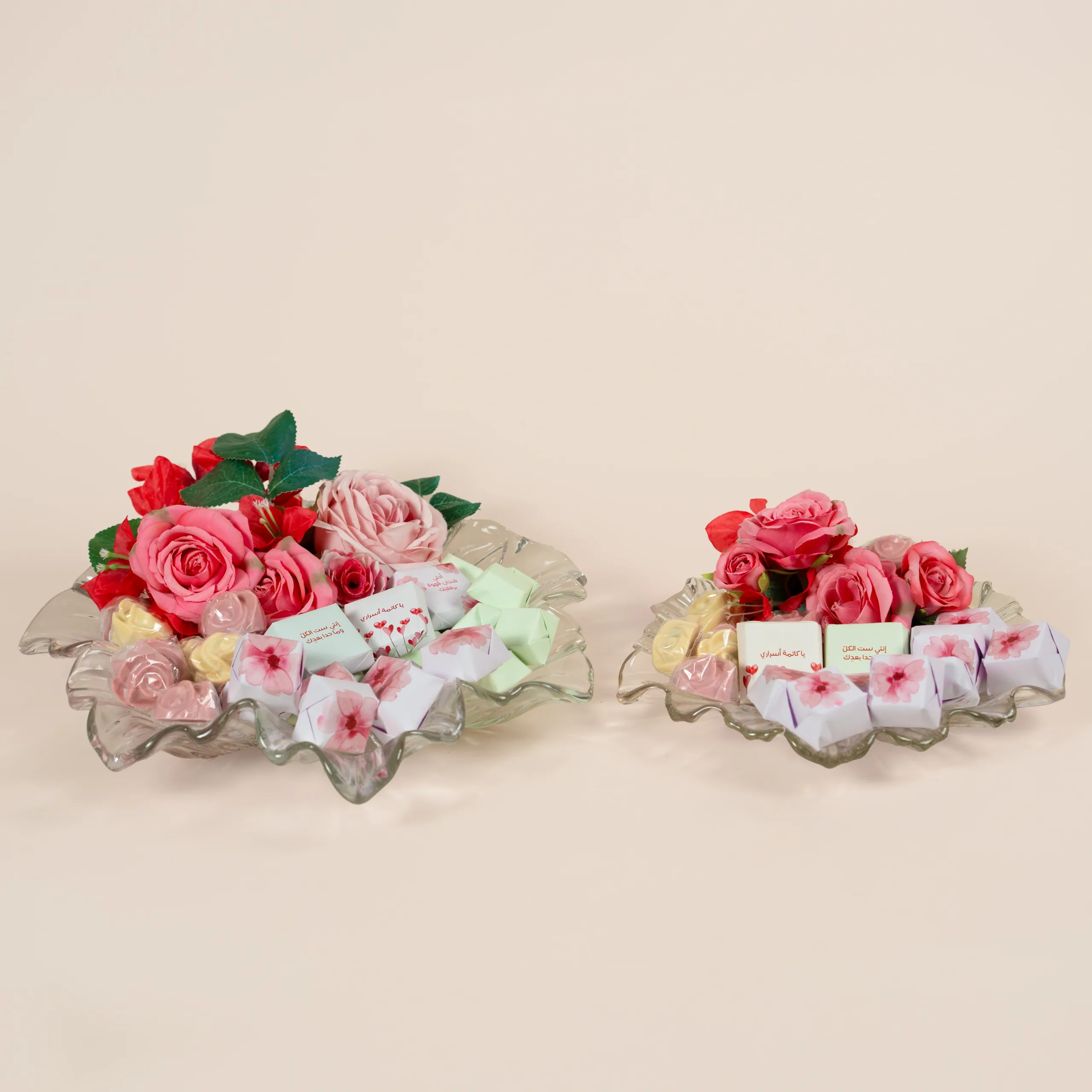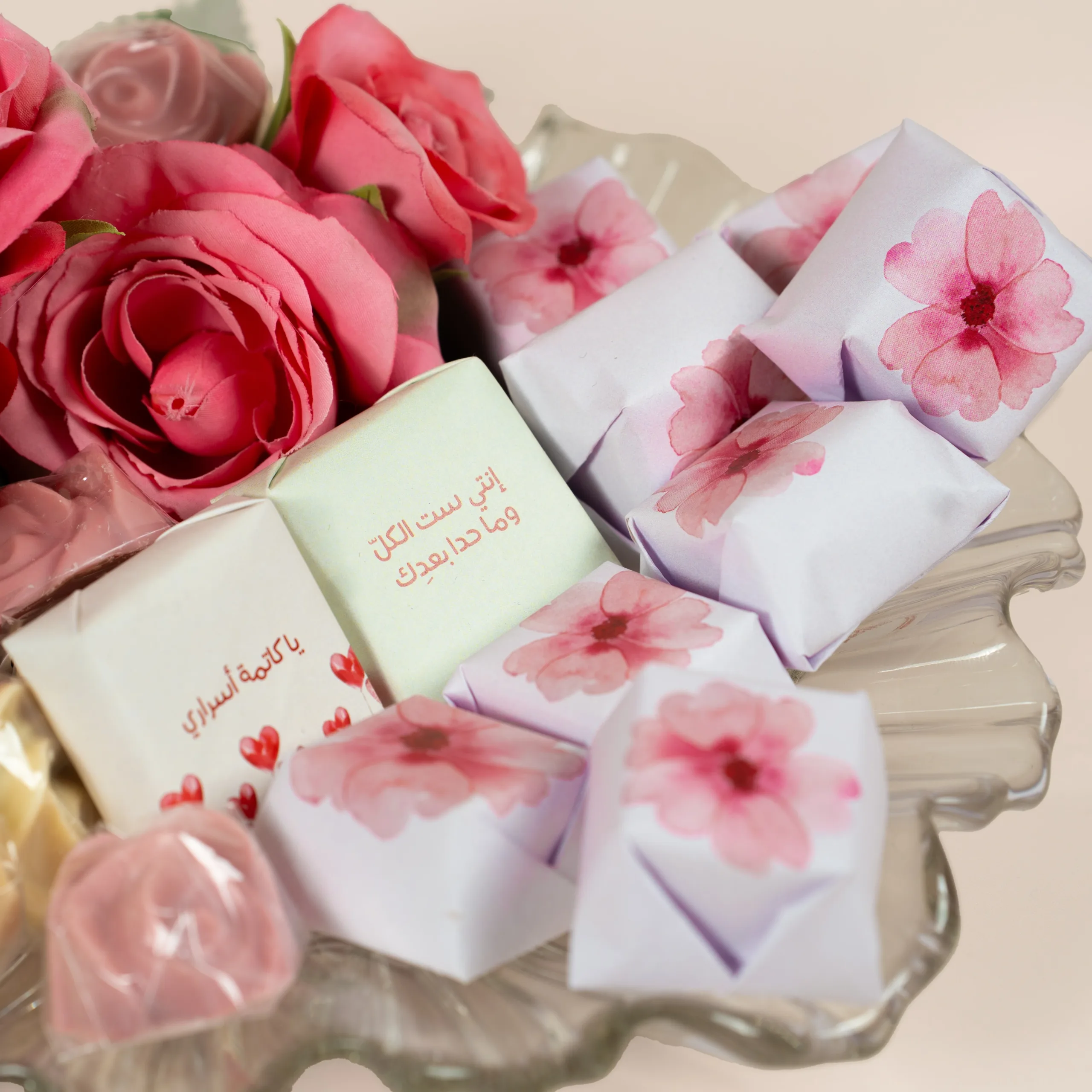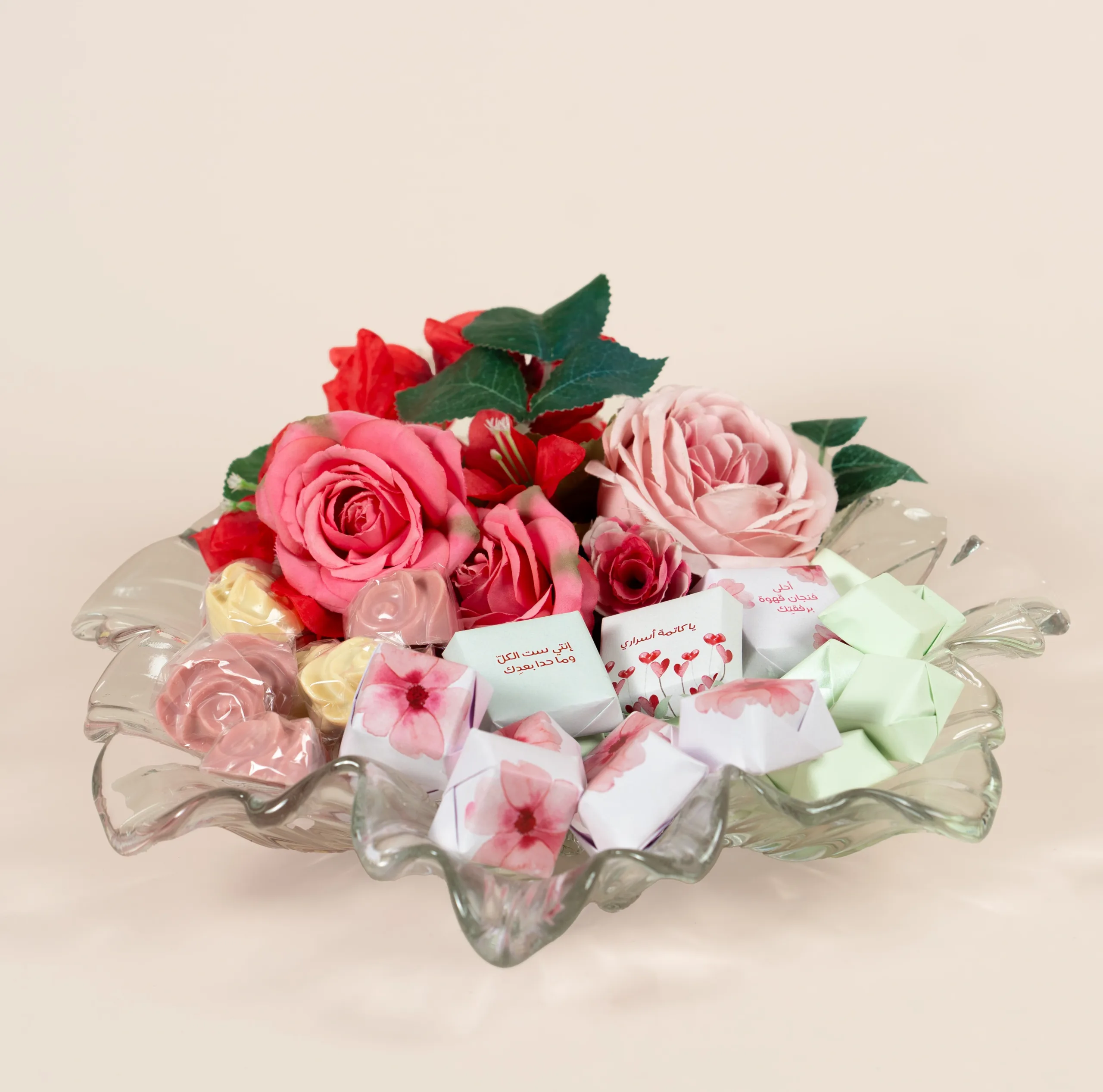 A decorated, flower-shaped glass plate filled with 100% premium Belgian chocolate.