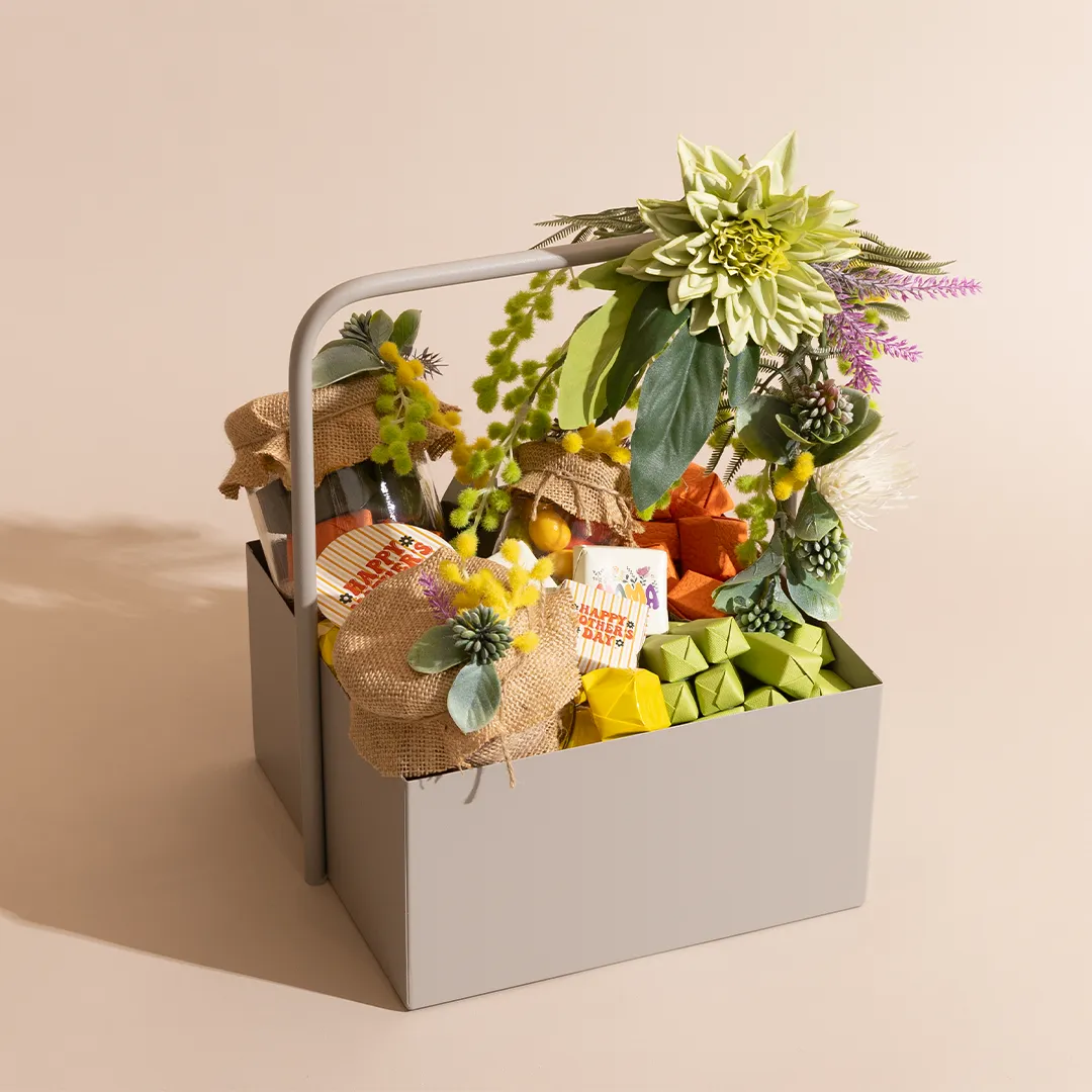 $145 – $165Price range: $145 through $165A floral metallic hamper with decorated glass jars, offered in two sizes, showcasing 800 g and 1 kg of premium Belgian chocolates and fruit-coated chocolate dragées -