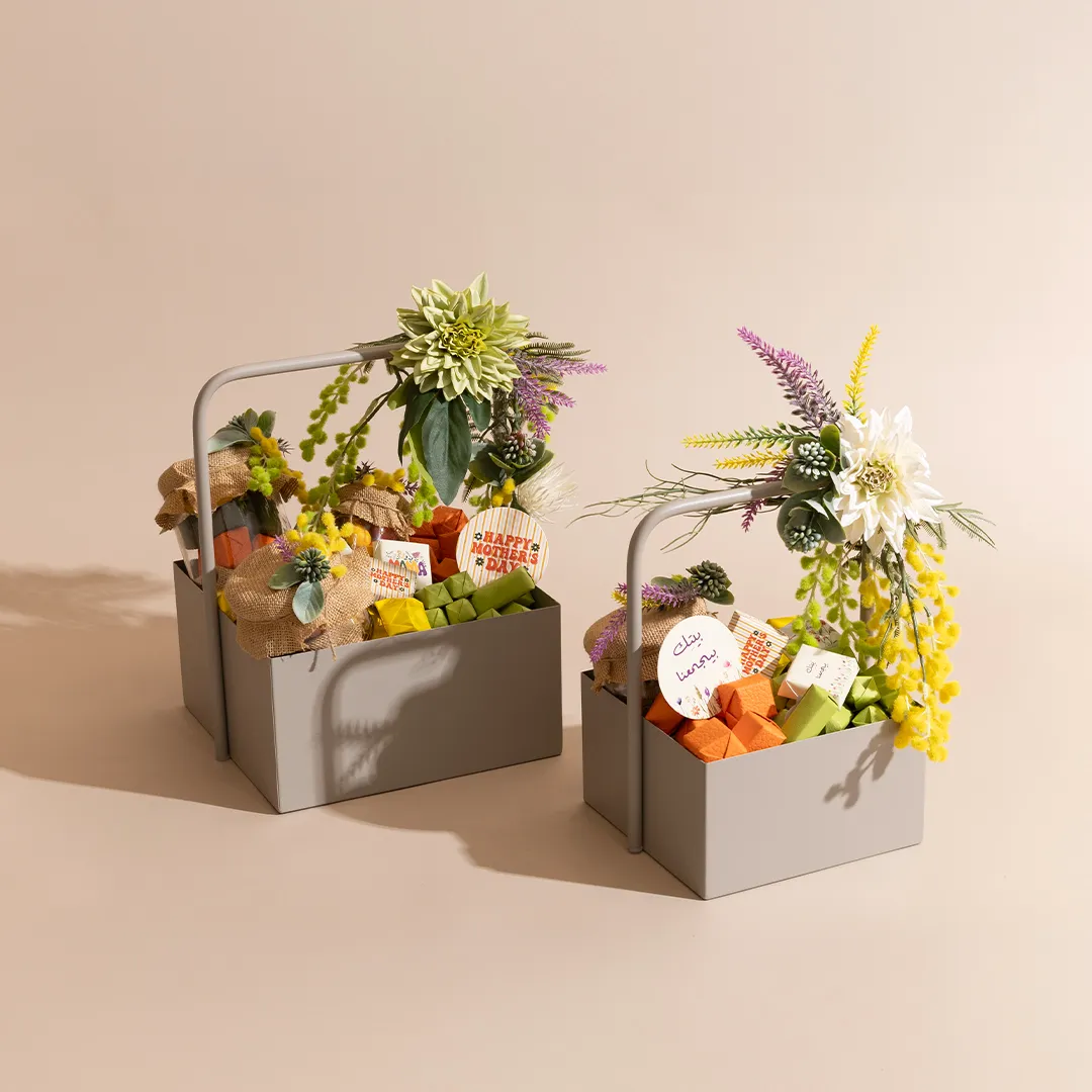 A floral metallic hamper with decorated glass jars, offered in two sizes, showcasing 500 g and 1 kg of premium Belgian chocolates and fruit-coated chocolate dragées