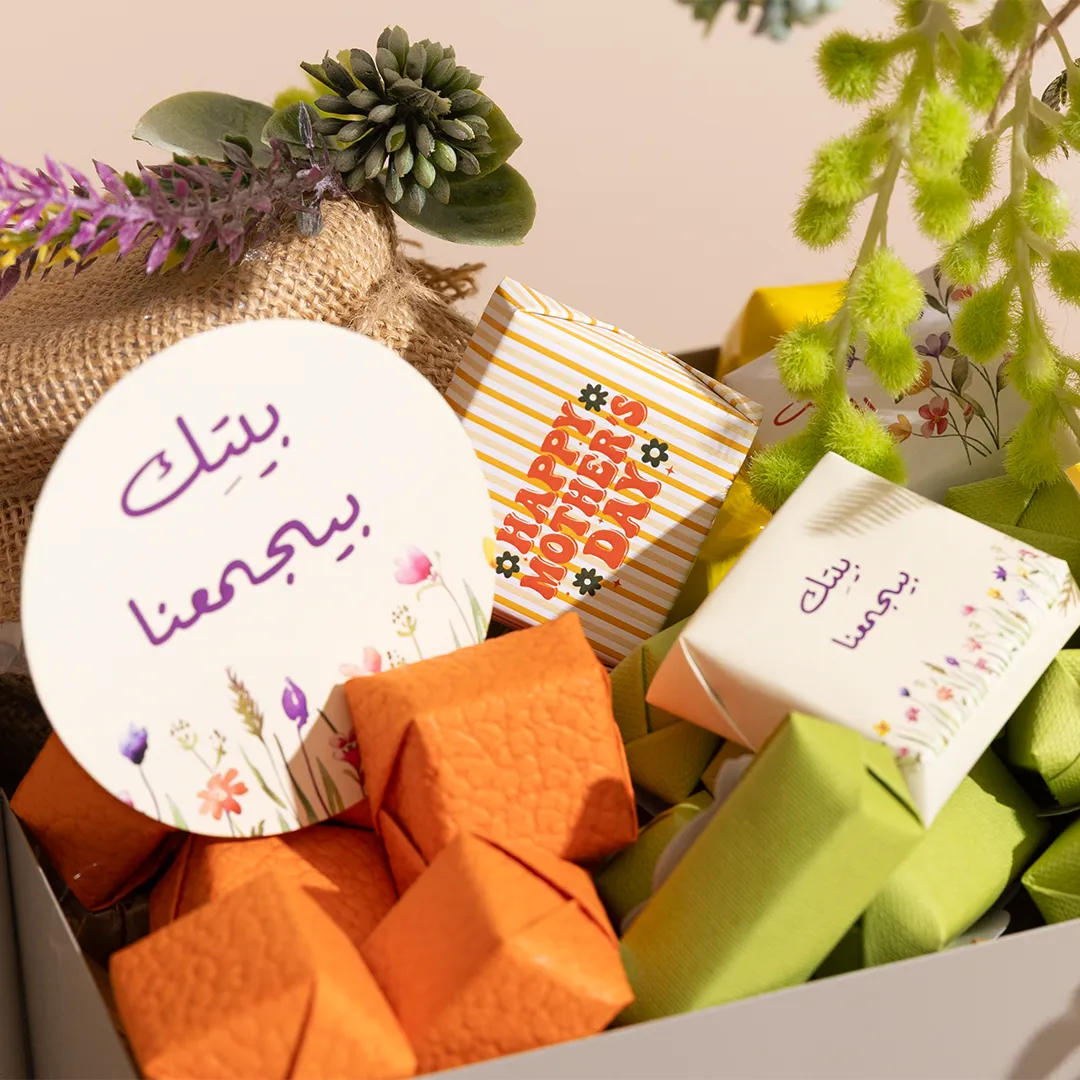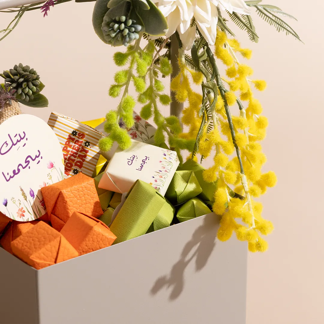 $90 – $140Price range: $90 through $140A floral metallic tray, framed with a house-shaped handle and adorned with decorated glass jars, available in two sizes showcasing 500 g and 580 g of premium Belgian chocolates and fruit-coated chocolate dragées -