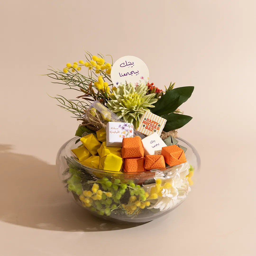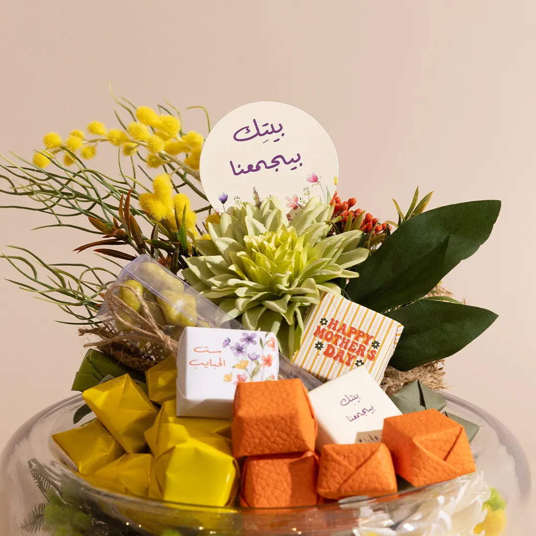 $90 – $140Price range: $90 through $140A floral metallic tray, framed with a house-shaped handle and adorned with decorated glass jars, available in two sizes showcasing 500 g and 580 g of premium Belgian chocolates and fruit-coated chocolate dragées -