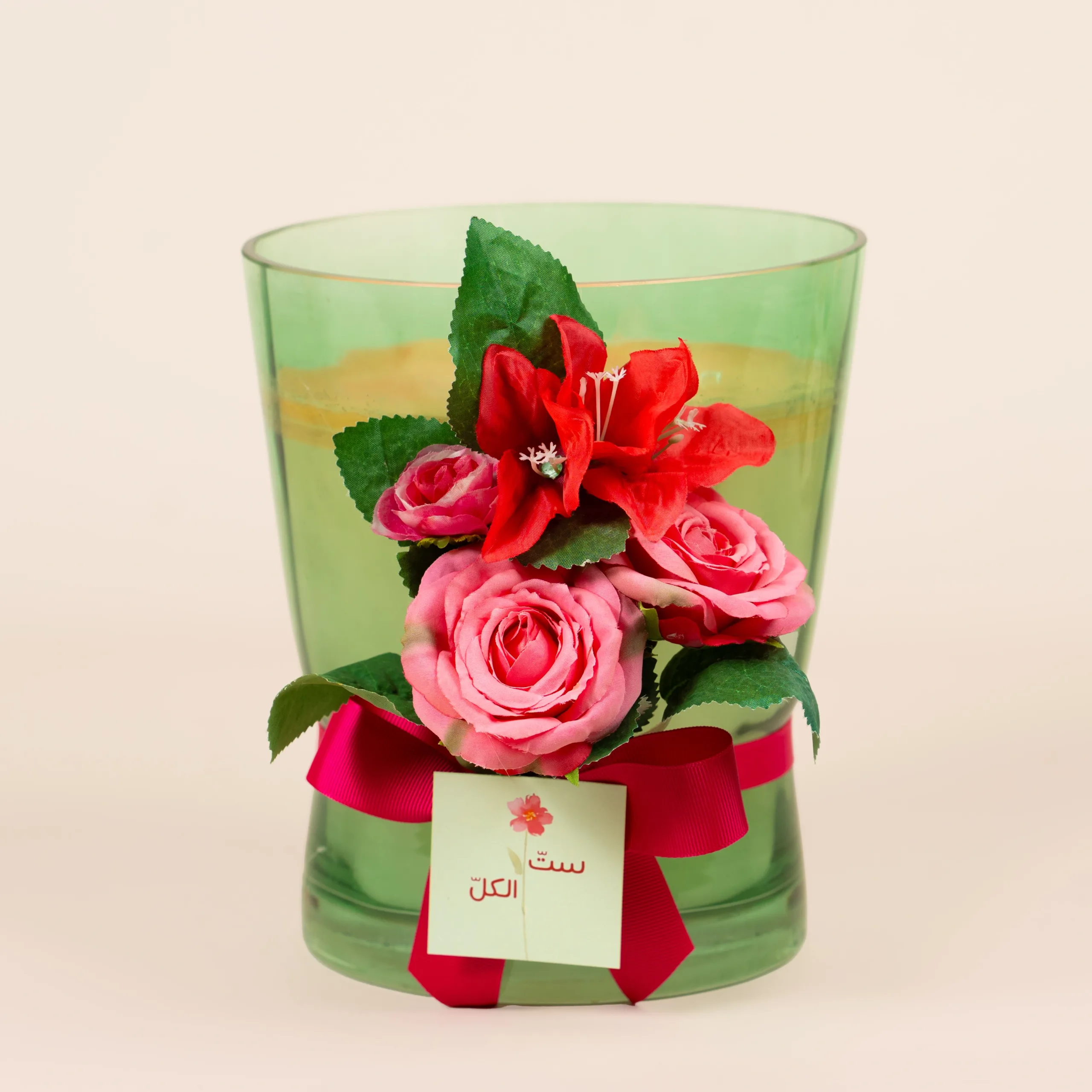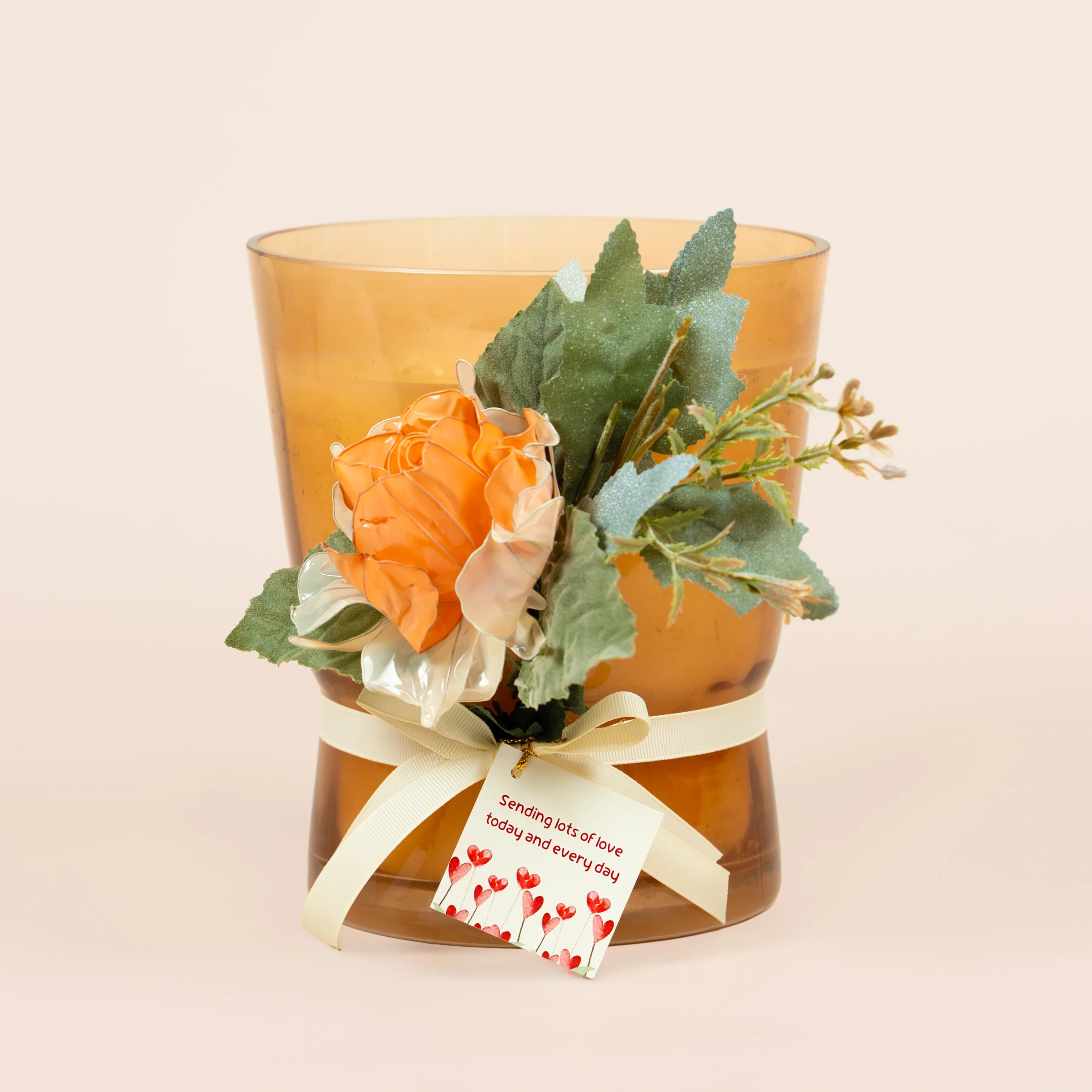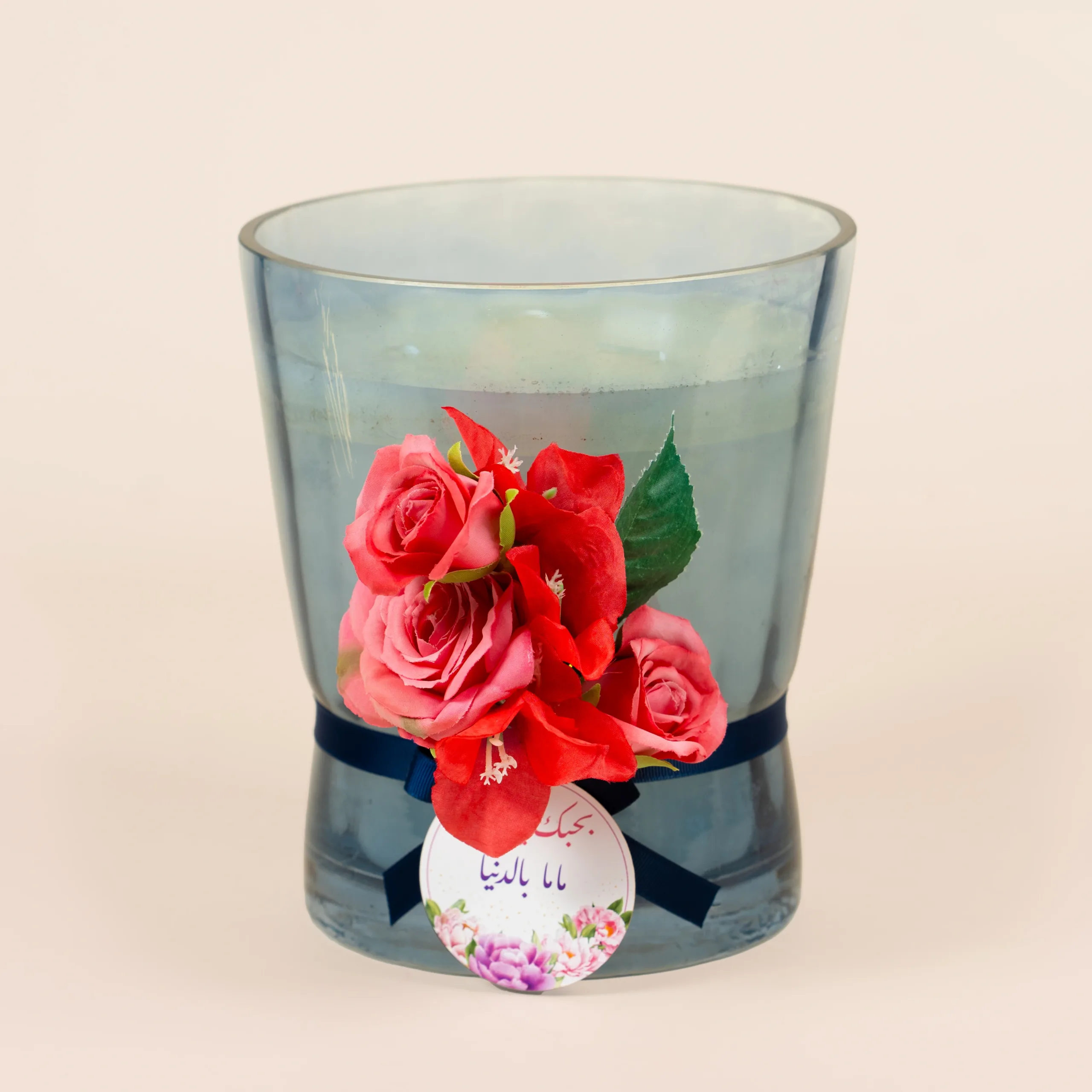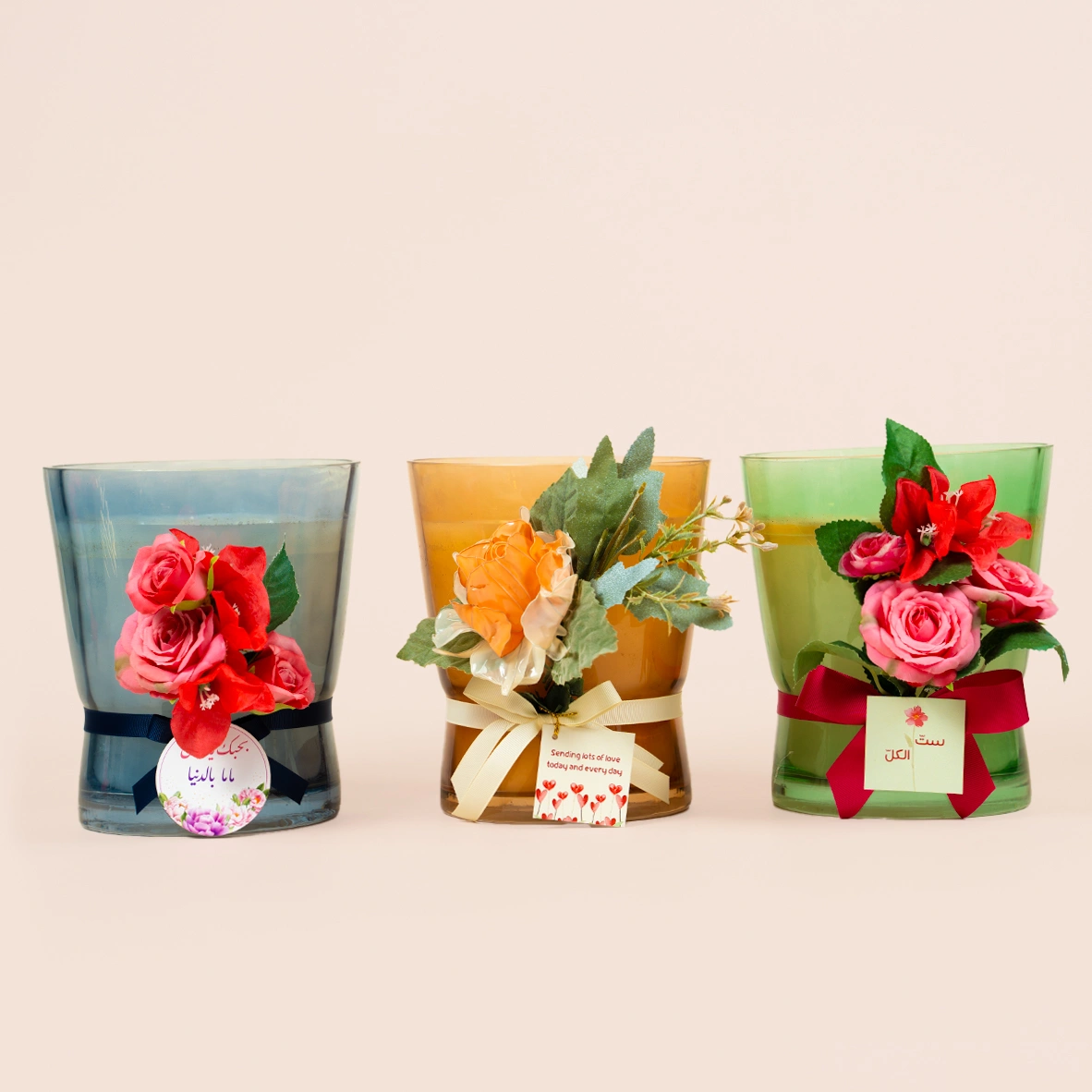 Colorful glass candles with floral decorations and sweet notes.