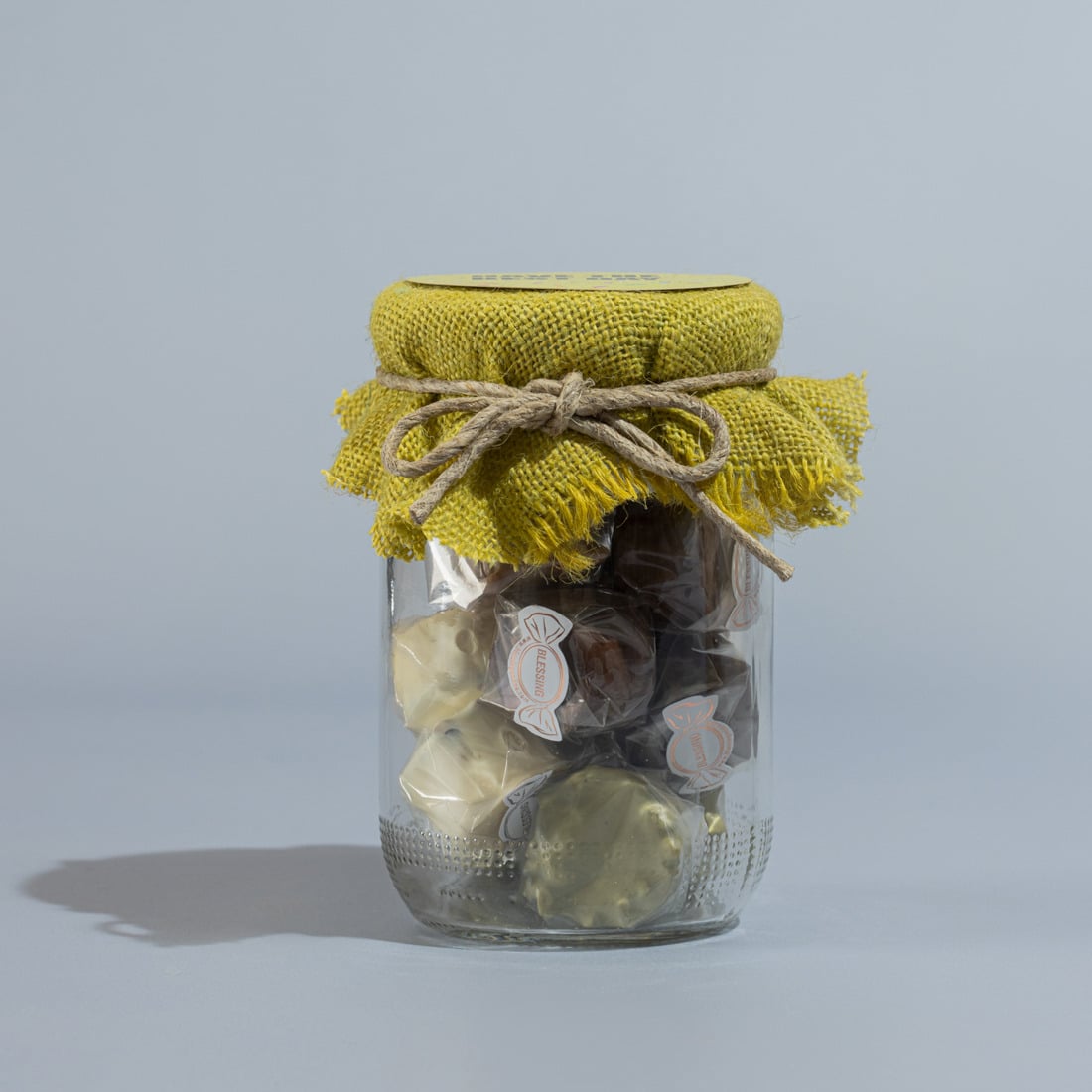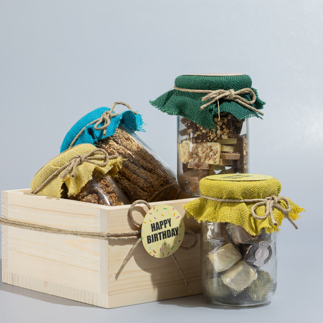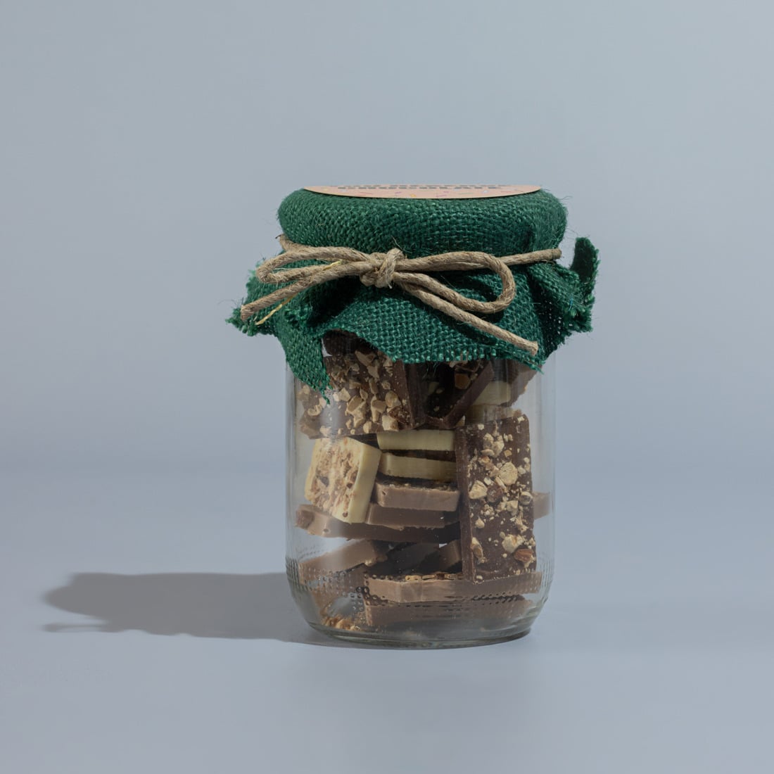 USD90A gift box including a candle, doorhanger and 700 grams of 100% premium Belgian chocolate, including: -Milk and white chocolate with hazelnut praline -Plain white chocolate -