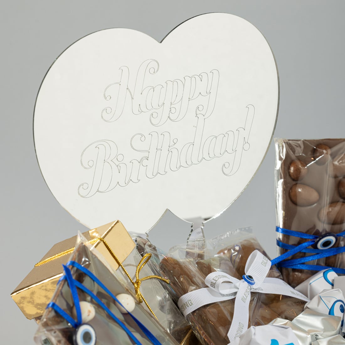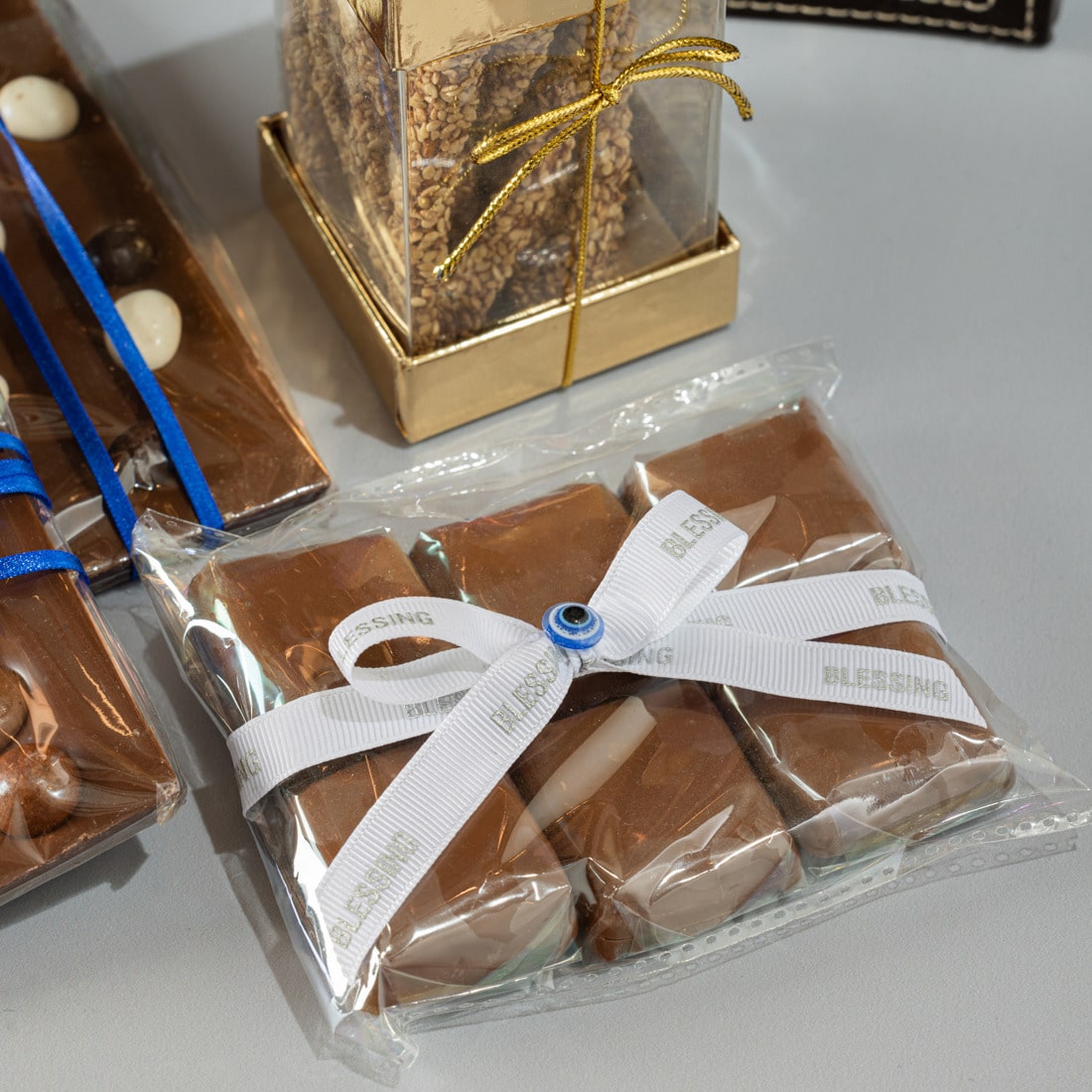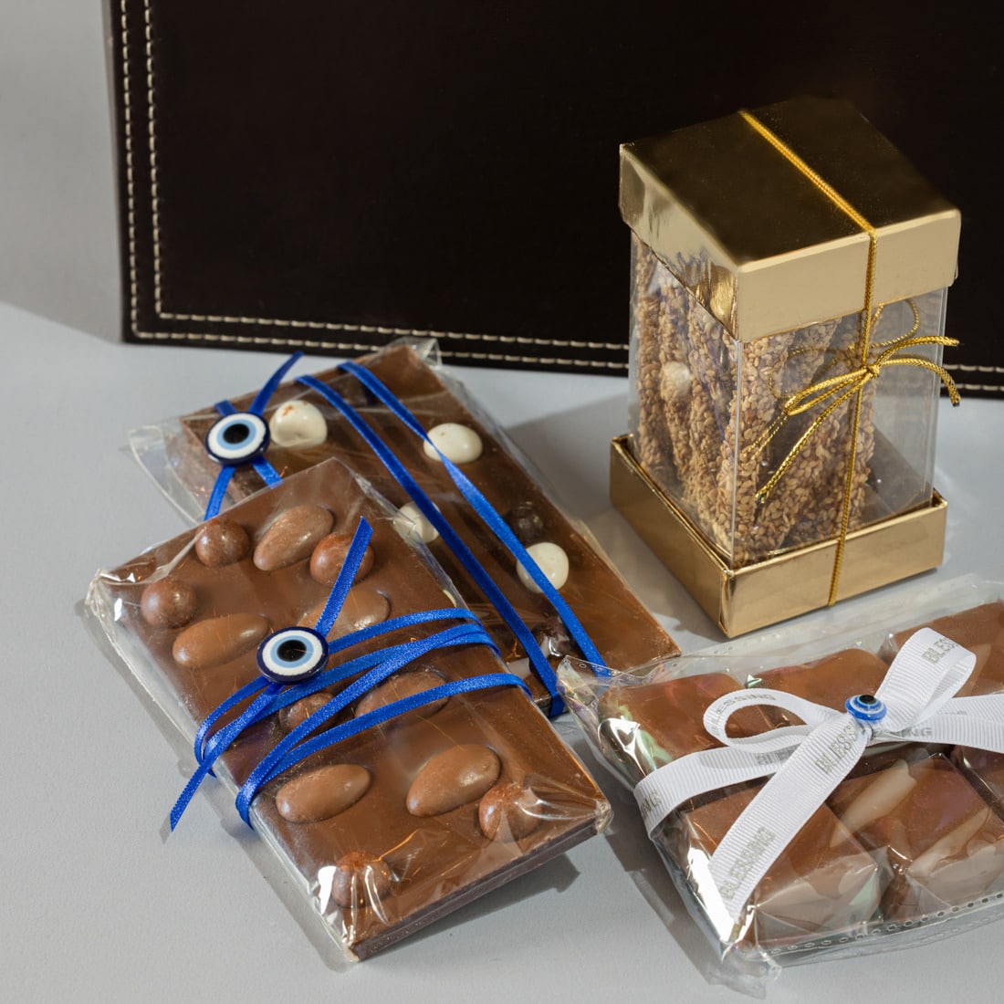 USD90A gift box including a candle, doorhanger and 700 grams of 100% premium Belgian chocolate, including: -Milk and white chocolate with hazelnut praline -Plain white chocolate -