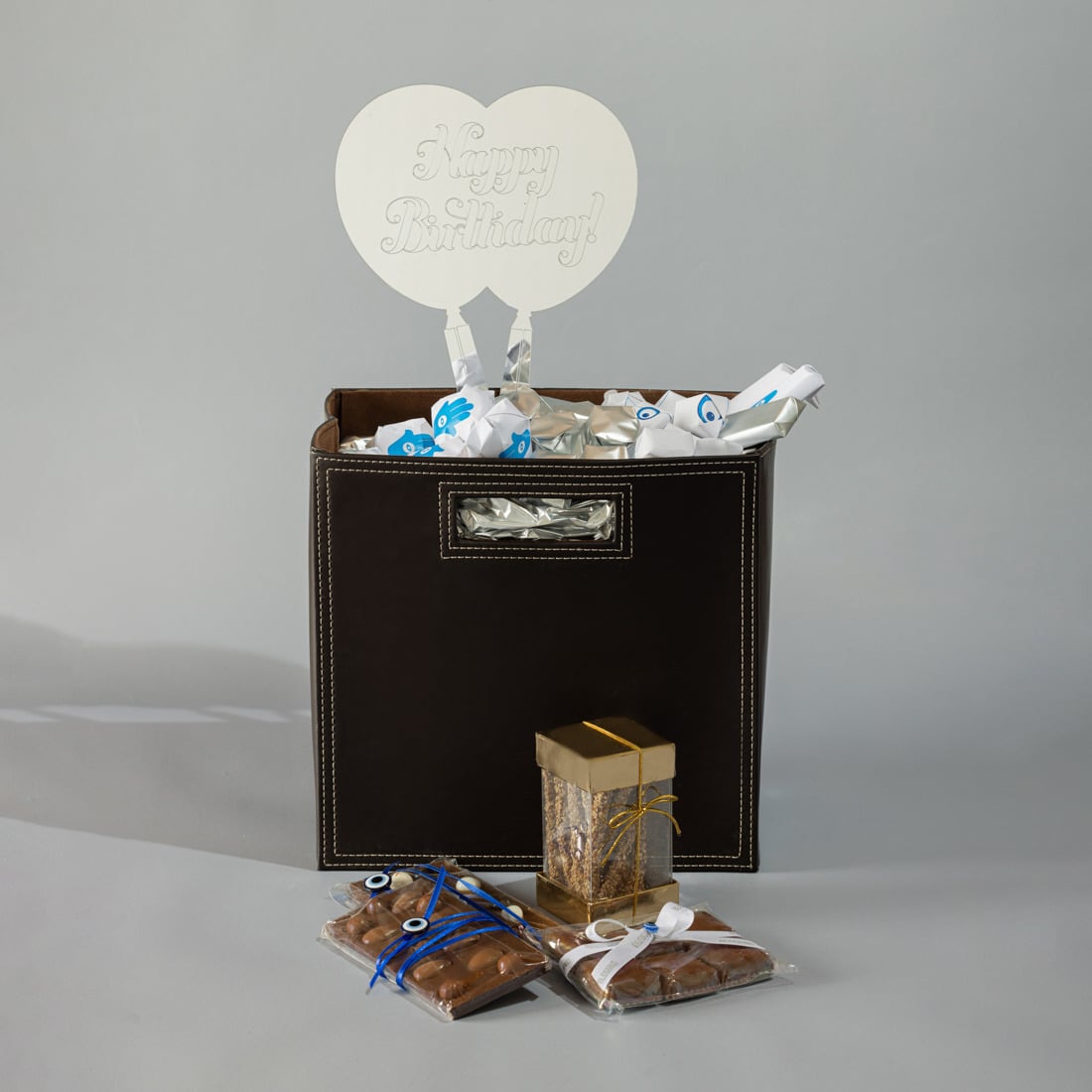 A leather basket including 900 grams of 100% premium Belgian chocolate, including: