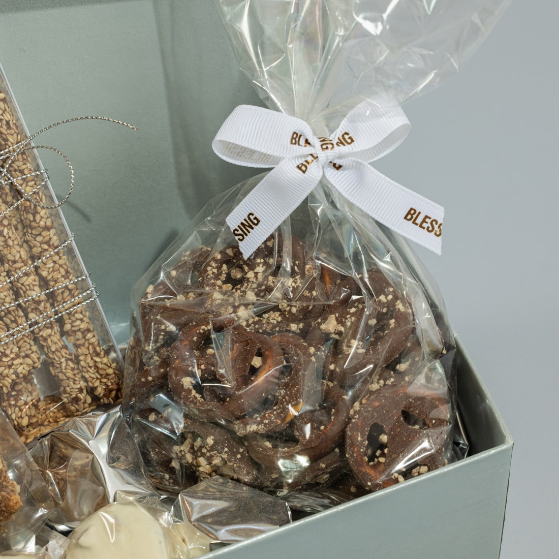 A gift box including 850 grams of 100% premium Belgian chocolate, including: