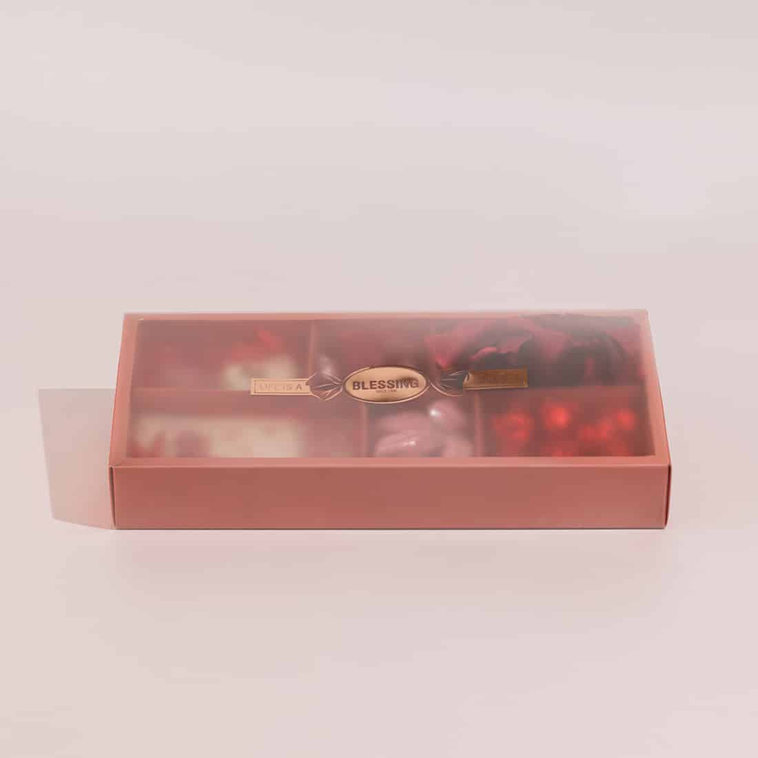 USD90A gift box including a candle, doorhanger and 700 grams of 100% premium Belgian chocolate, including: -Milk and white chocolate with hazelnut praline -Plain white chocolate -