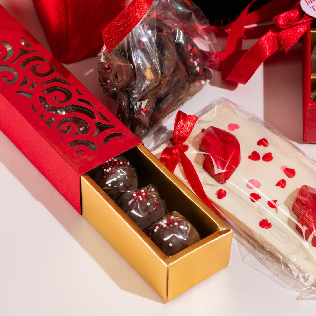USD106A festive gift set including three heart-shaped boxes with 685 grams of 100% premium Belgian milk chocolate. -