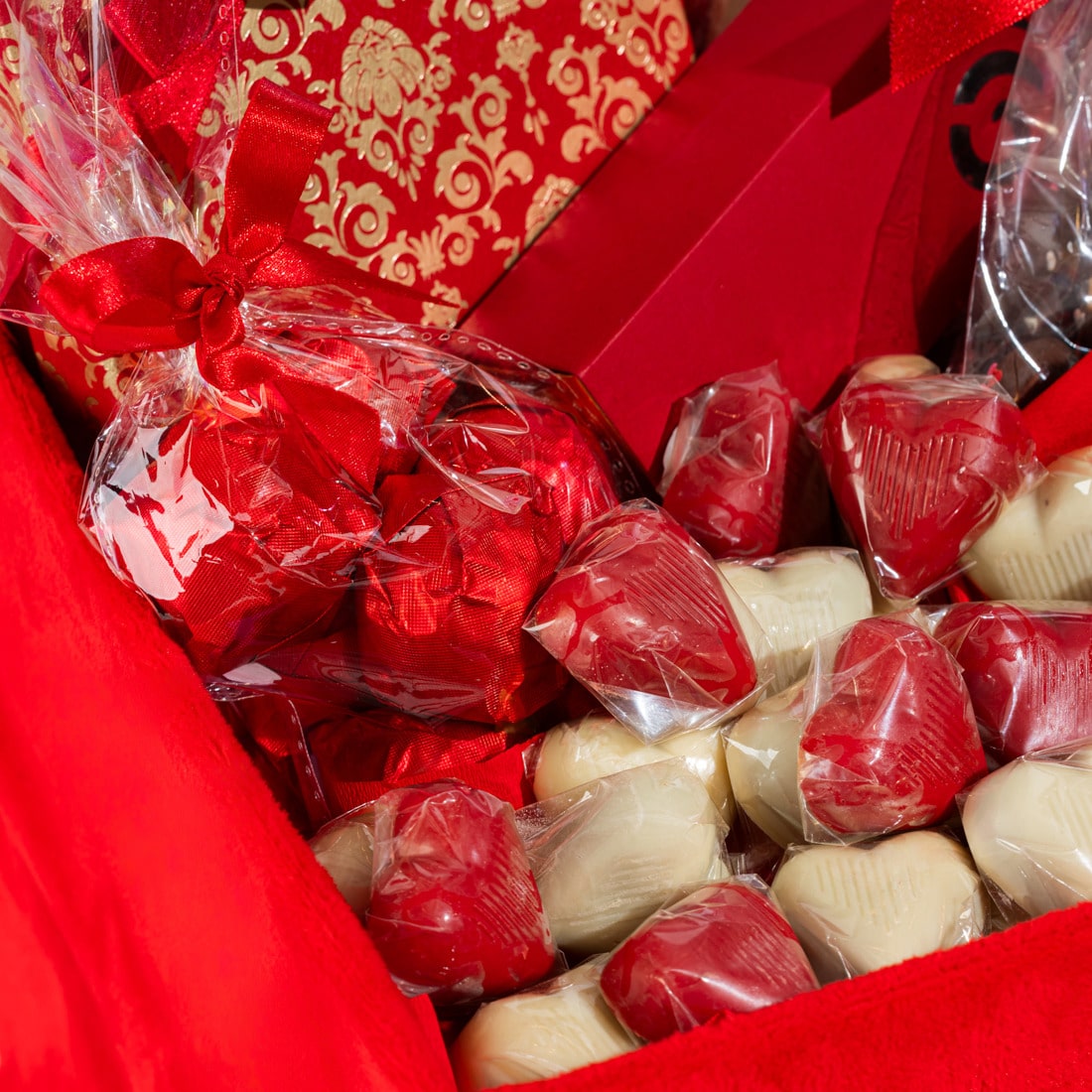 USD83A gift box including 550 grams of 100% premium Belgian milk and white chocolate with hazelnut praline