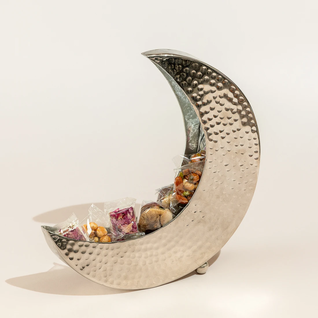 A metallic crescent holding 700 g of assorted oriental sweets.