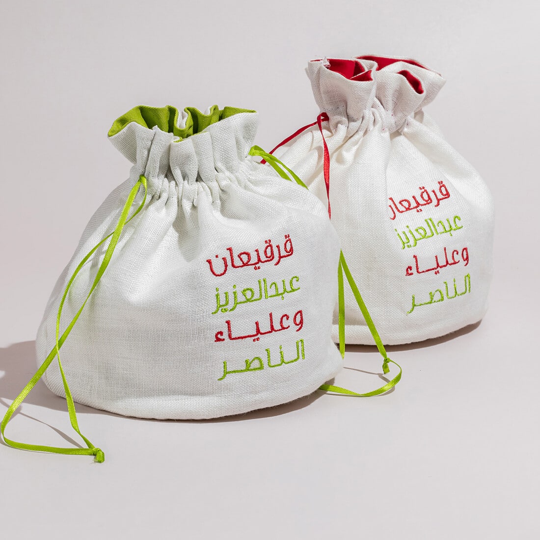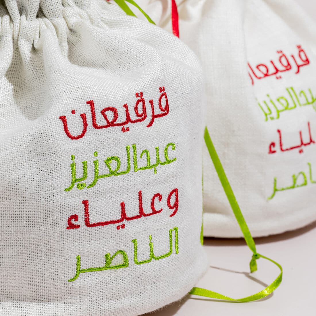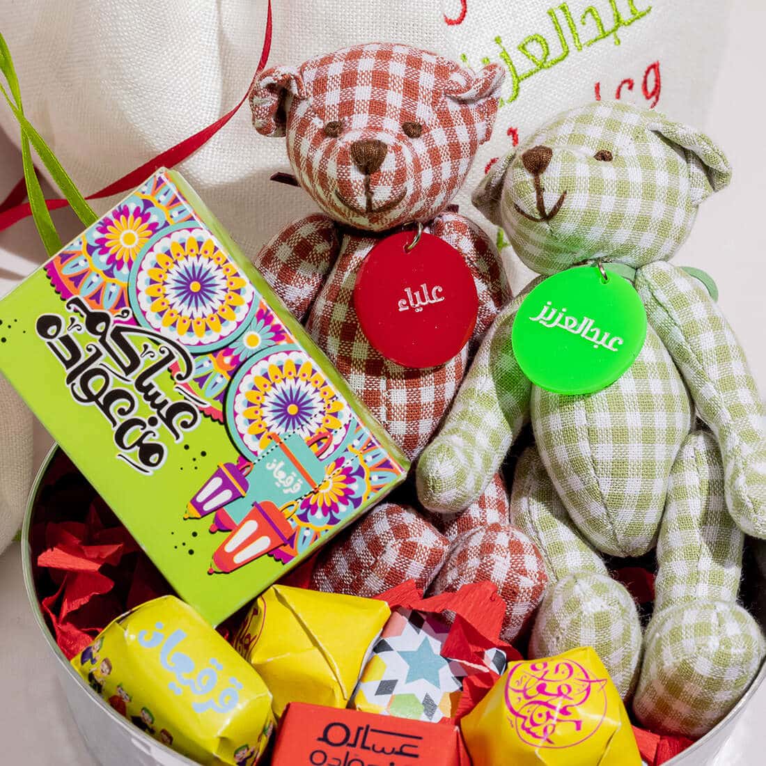 An embroidered, linen pouch holding two stuffed teddy bears with names, Ramadan-themed chocolate and a box of salted nuts