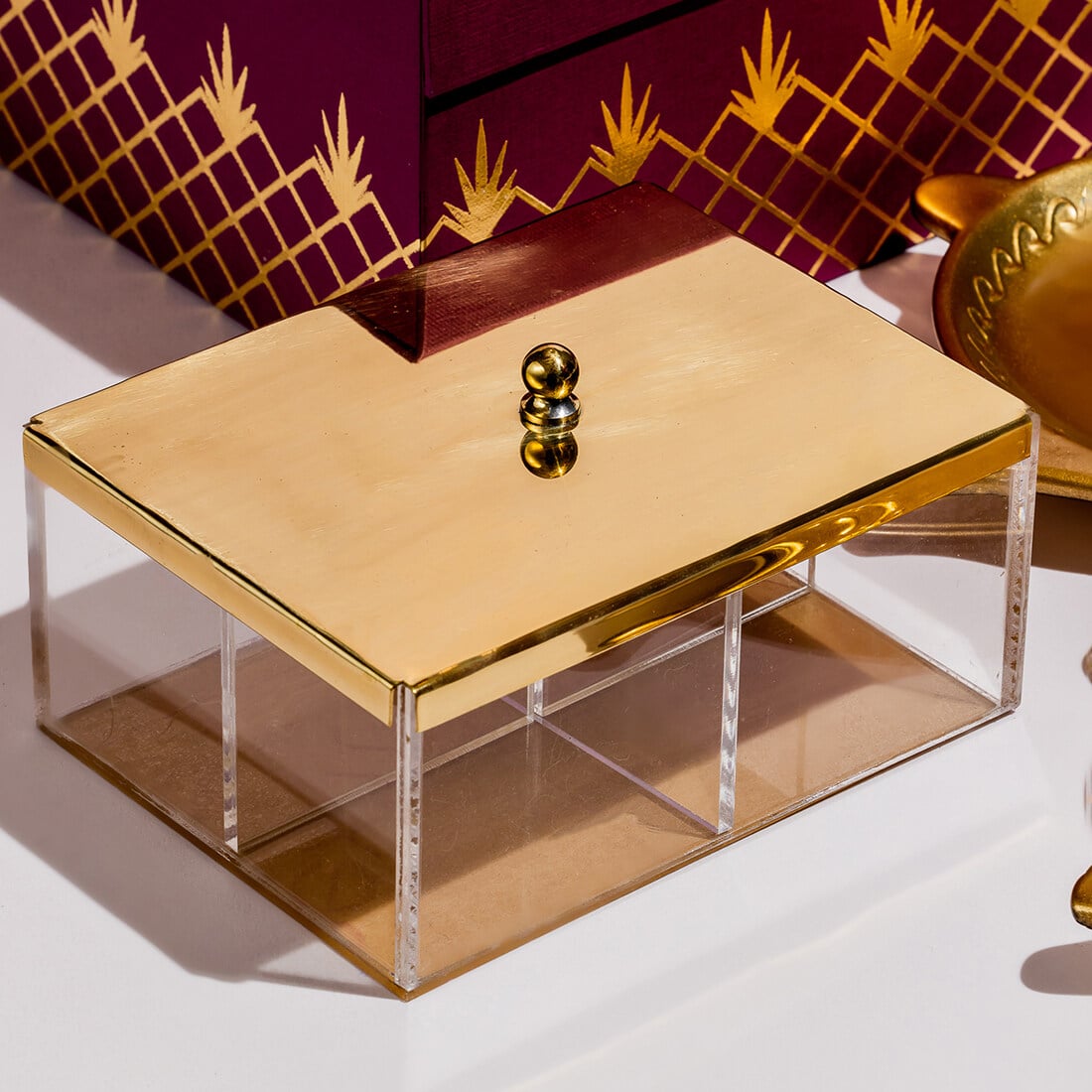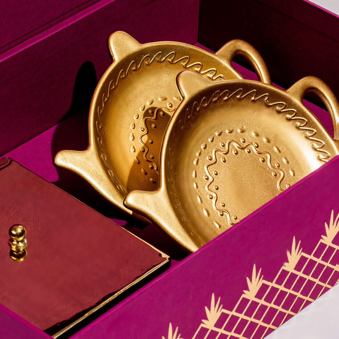 A customized gift box including two teapot-shaped ceramic plates and a plexi box with a steel cover
