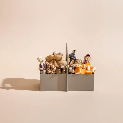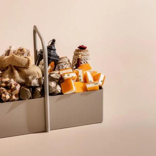 $95 – $140Price range: $95 through $140A metallic hamper with a handle, featuring a glowing lantern, decorated jars of assorted chocolates and dragees, and miniature figurines with oriental accents, available in two sizes holding 650 g and 1.1 kg of premium Belgian chocolates and oriental sweets. -