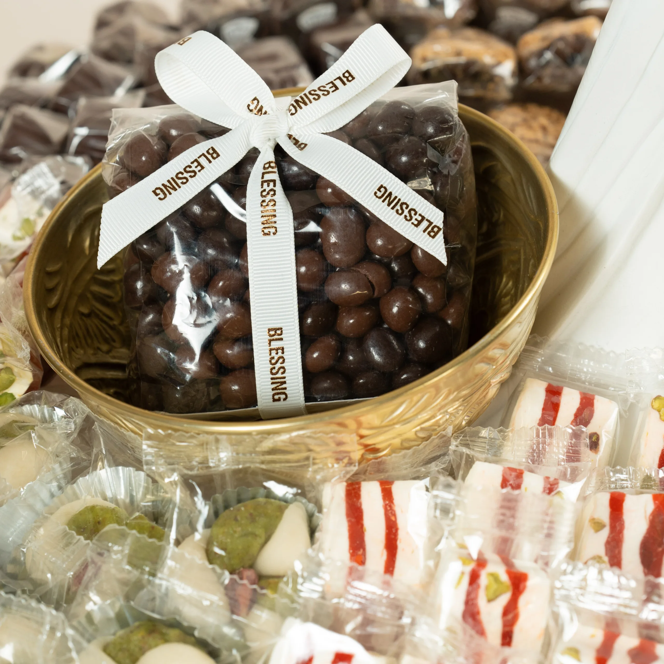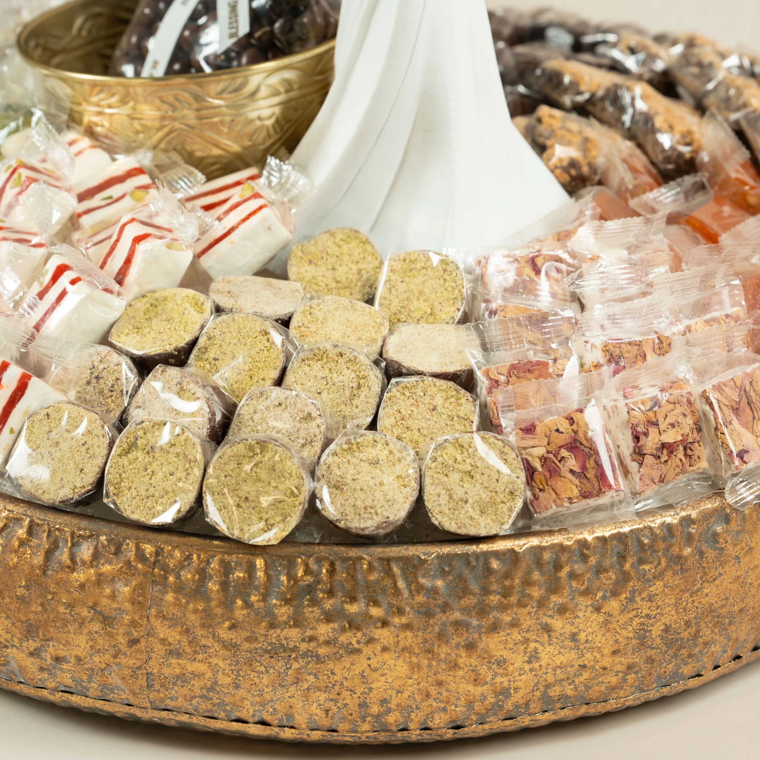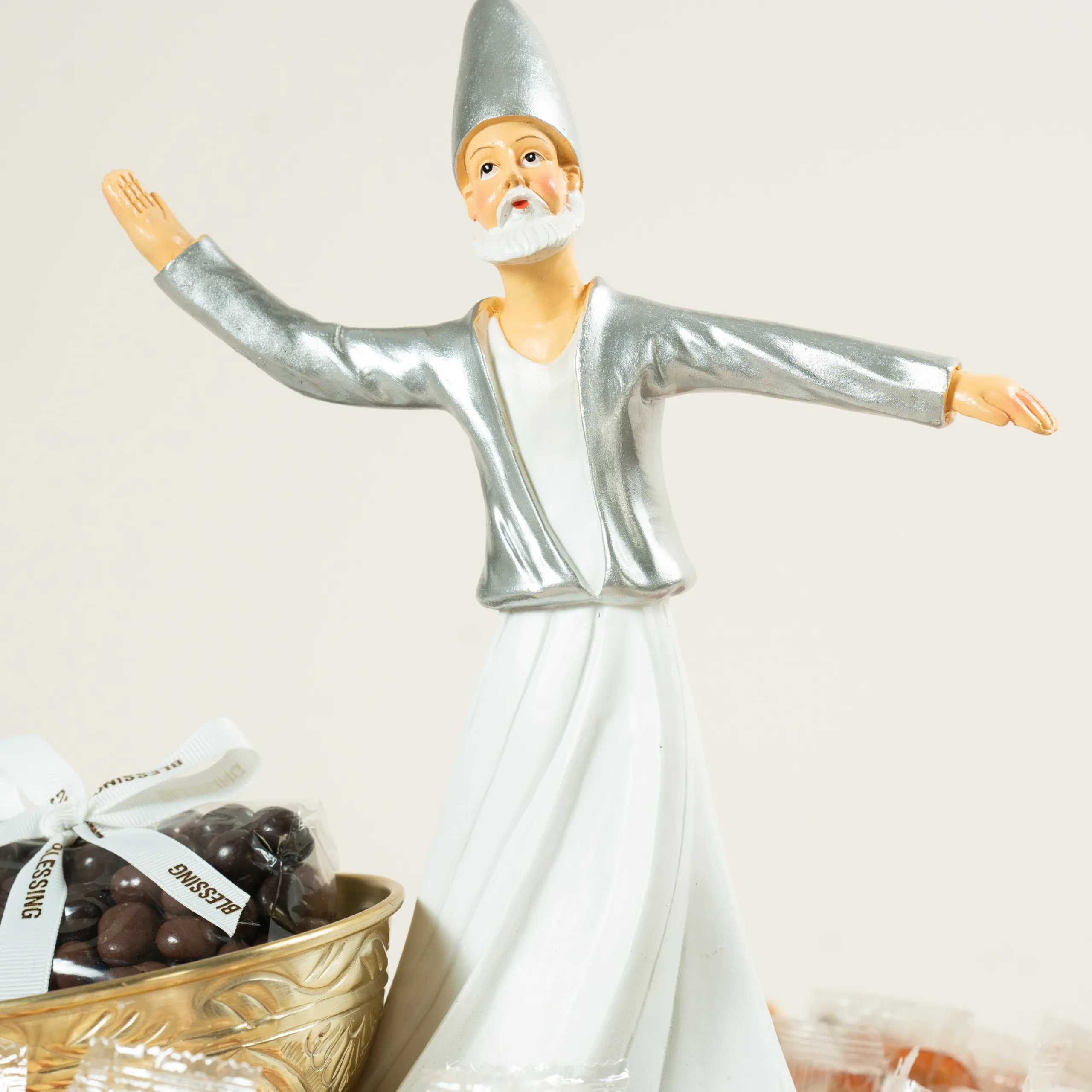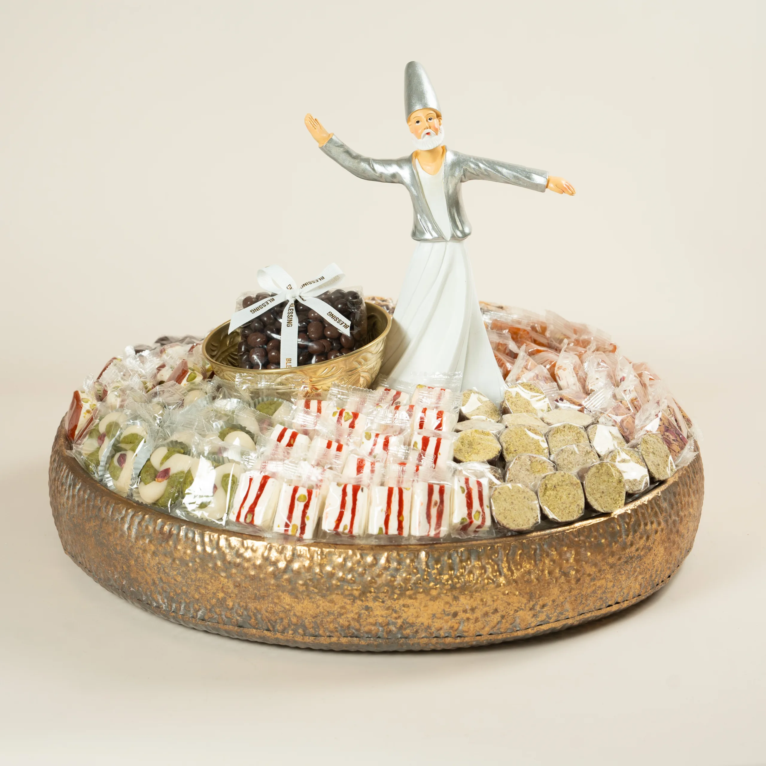 A hammered, metallic tray with the traditional dancing darwich, holding 2.82 kg of assorted Belgian chocolate and oriental sweets