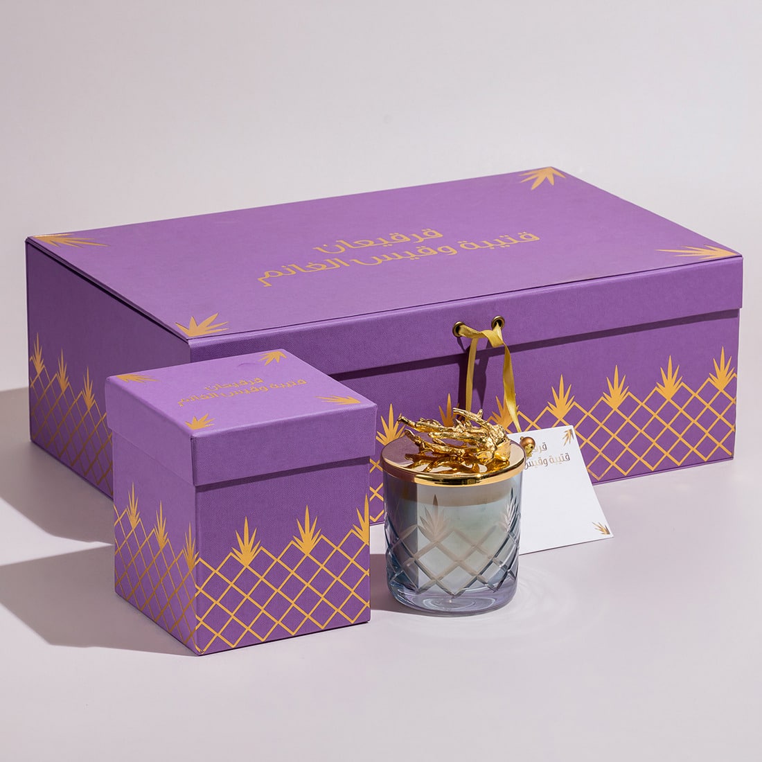 A customized gift box including a scented candle a box of 100% premium Belgian chocolate
