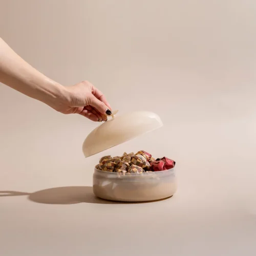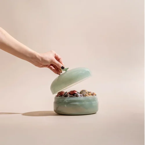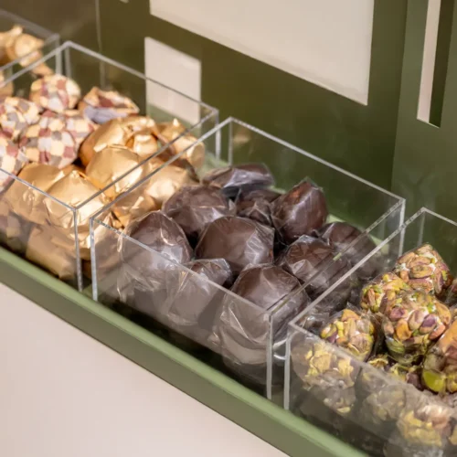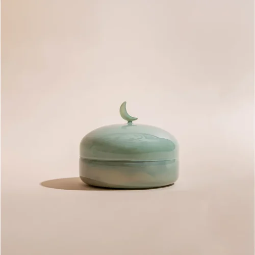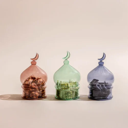 $70 – $130Price range: $70 through $130A pistache opaque glass bonbonnière with a lid featuring a crescent handle, available in two sizes and filled with 0.5 kg and 0.9 kg of premium Belgian chocolates and oriental sweets.