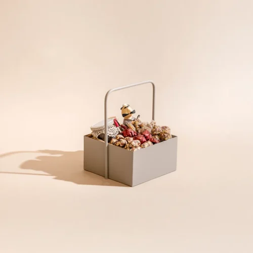 $80 – $120Price range: $80 through $120A metallic hamper with a handle, featuring a glowing lantern, decorated jars of assorted chocolates and dragees, and miniature figurines with oriental accents, available in two sizes holding 400 g and 1 kg of premium Belgian chocolates and oriental sweets -