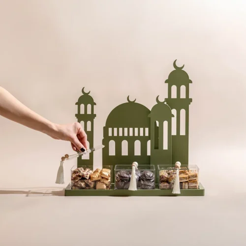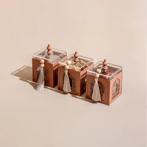 $235A metallic tray featuring mosque motifs, holding three acrylic boxes with lids and matching tassels, filled with 1.8 kilograms of assorted premium Belgian chocolates and oriental sweets -