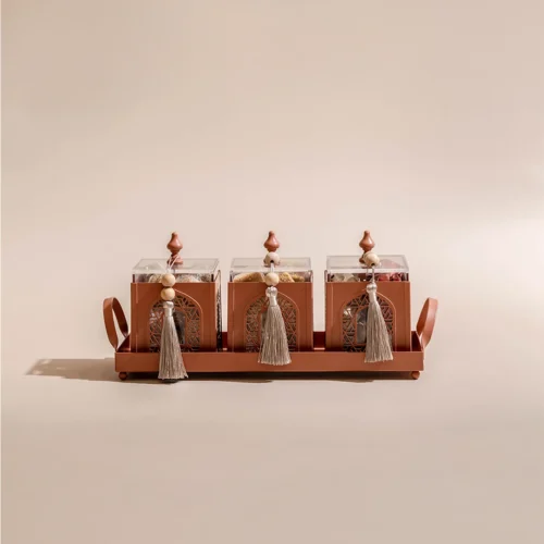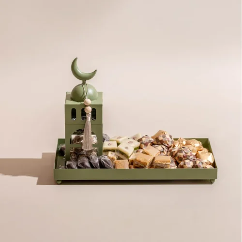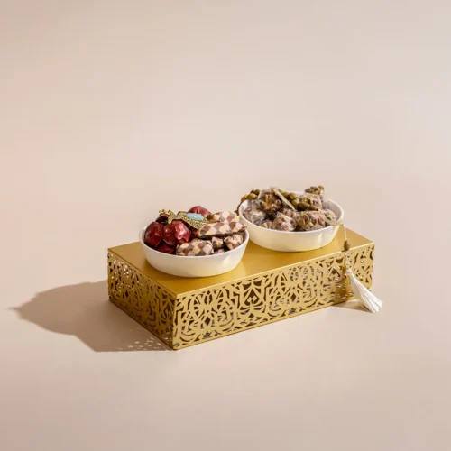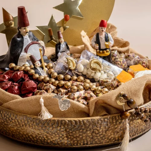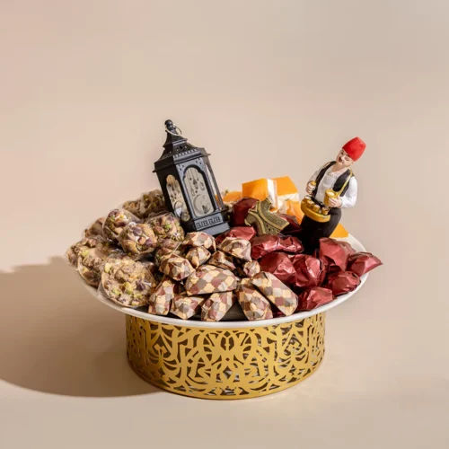$195 – $280Price range: $195 through $280A hand-hammered metallic tray available in two sizes, featuring Ramadan-inspired elements, accessories, and worry beads, filled with 1.32 kg and 2.4 kg of assorted premium Belgian chocolate and oriental sweets, respectively. -