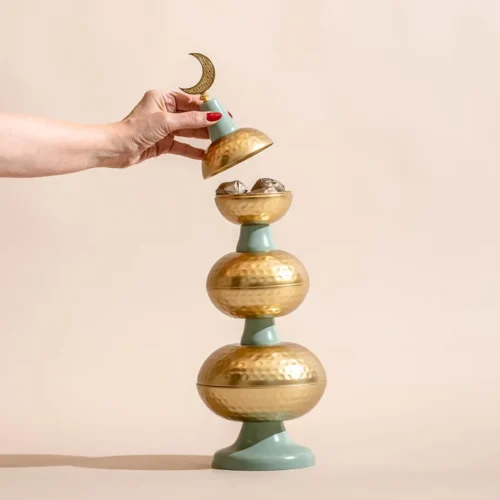$65 – $120Price range: $65 through $120Metallic and ceramic teal minarets in varying sizes, holding 300g, 400g, and 700g of assorted premium Belgian chocolates and oriental sweets, respectively -