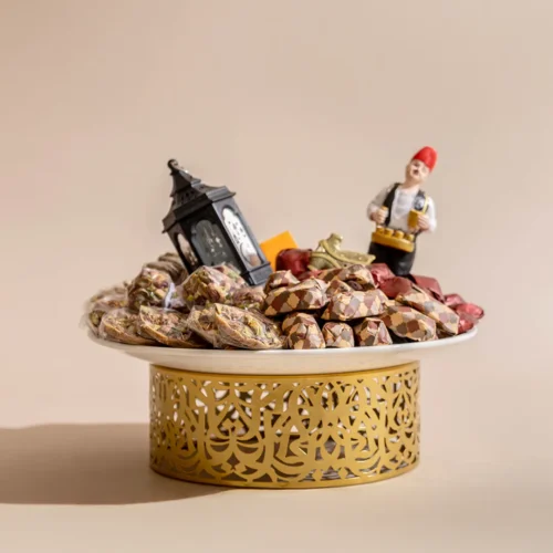 $165A ceramic plate set on an engraved metallic stand with Arabesque detailing, featuring a lantern that lights up and a Ramadani figurine, filled with 1.1 kg of premium Belgian chocolates and oriental sweets. -