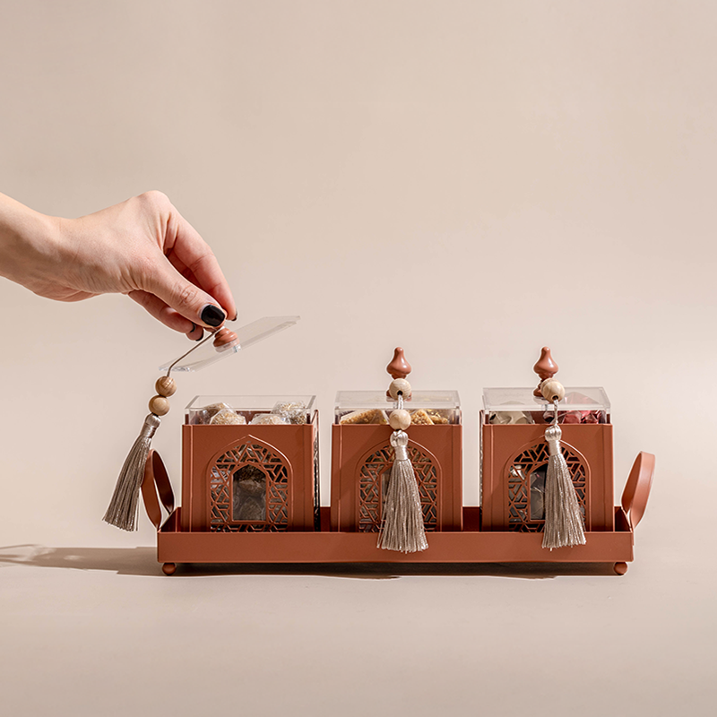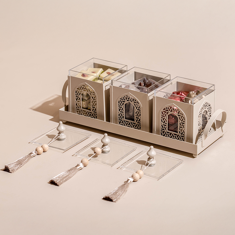 A metallic tray featuring a set of three arabesque boxes, adorned with beads matching and tassels, holding 850 grams of assorted premium Belgian chocolate and oriental sweets