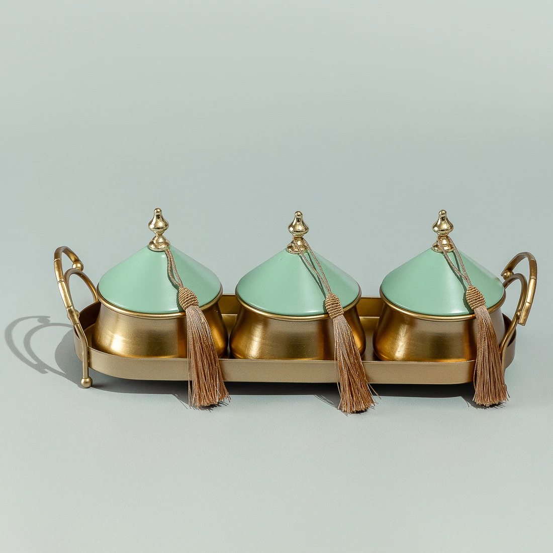 A metallic tray with a set of three bowls with oriental covers, holding 330 grams of assorted premium Belgian chocolate and oriental sweets.