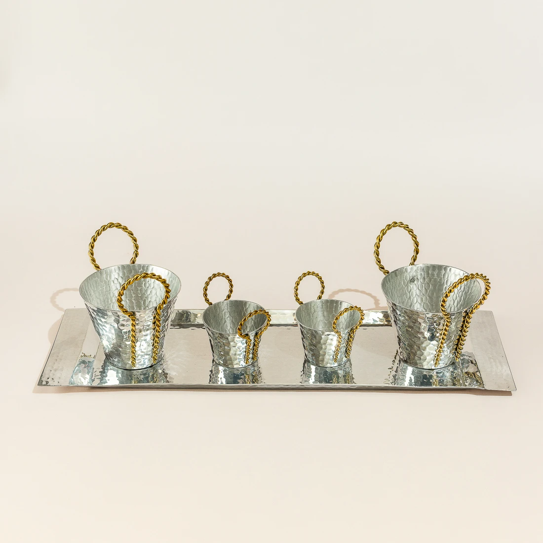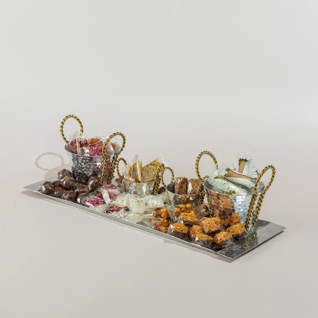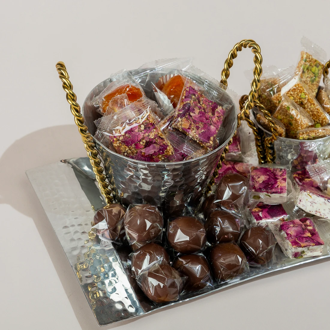 A hammered, metallic tray holding five matching baskets, including 800 g of assorted Belgian chocolate and oriental sweets