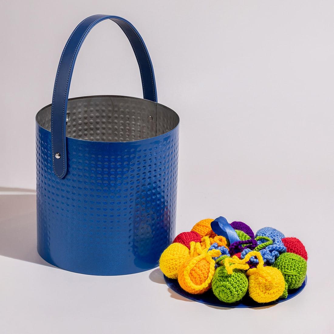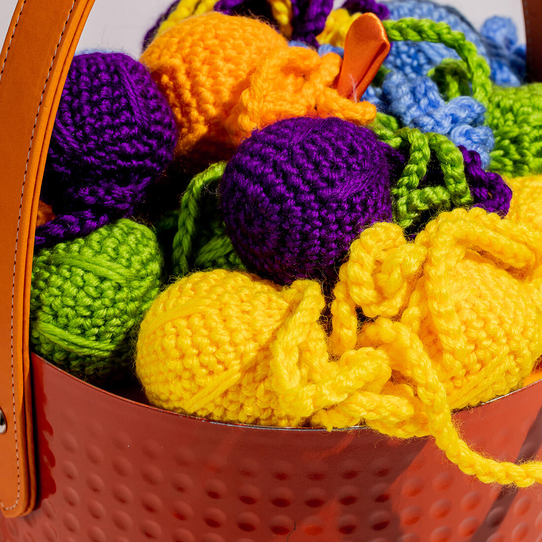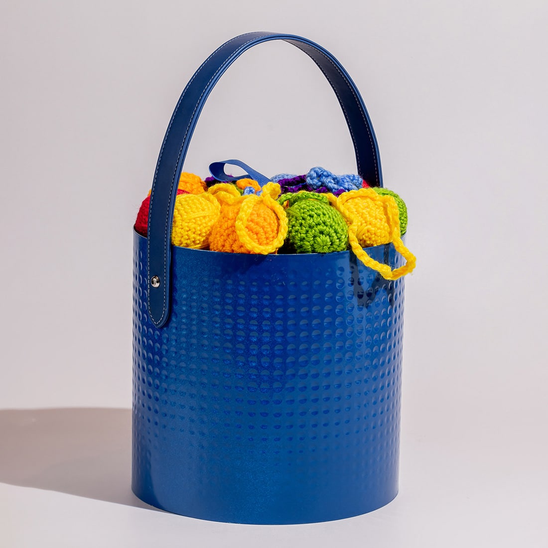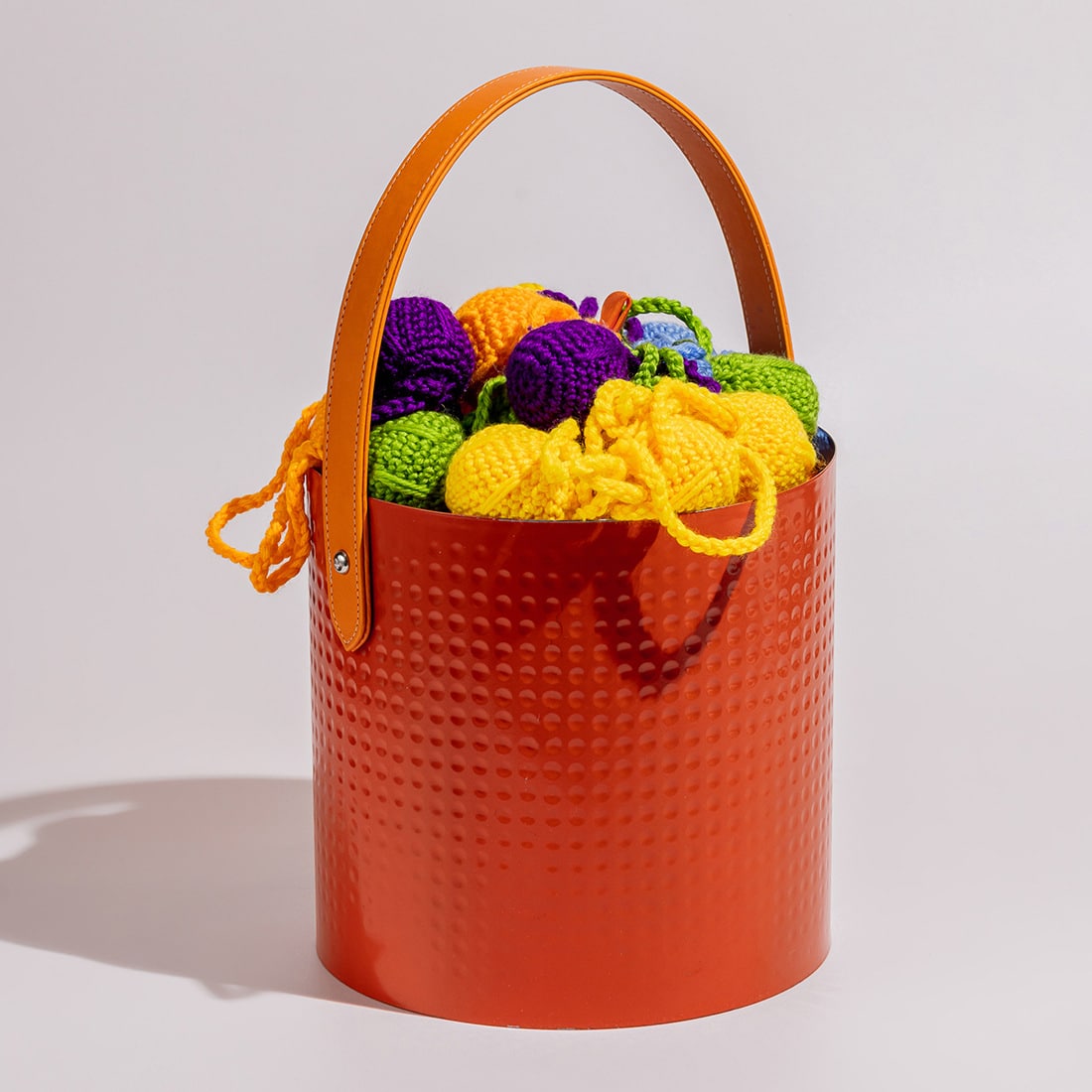 A metallic, hammered basket with a leather handle and a crochet-decorated lid