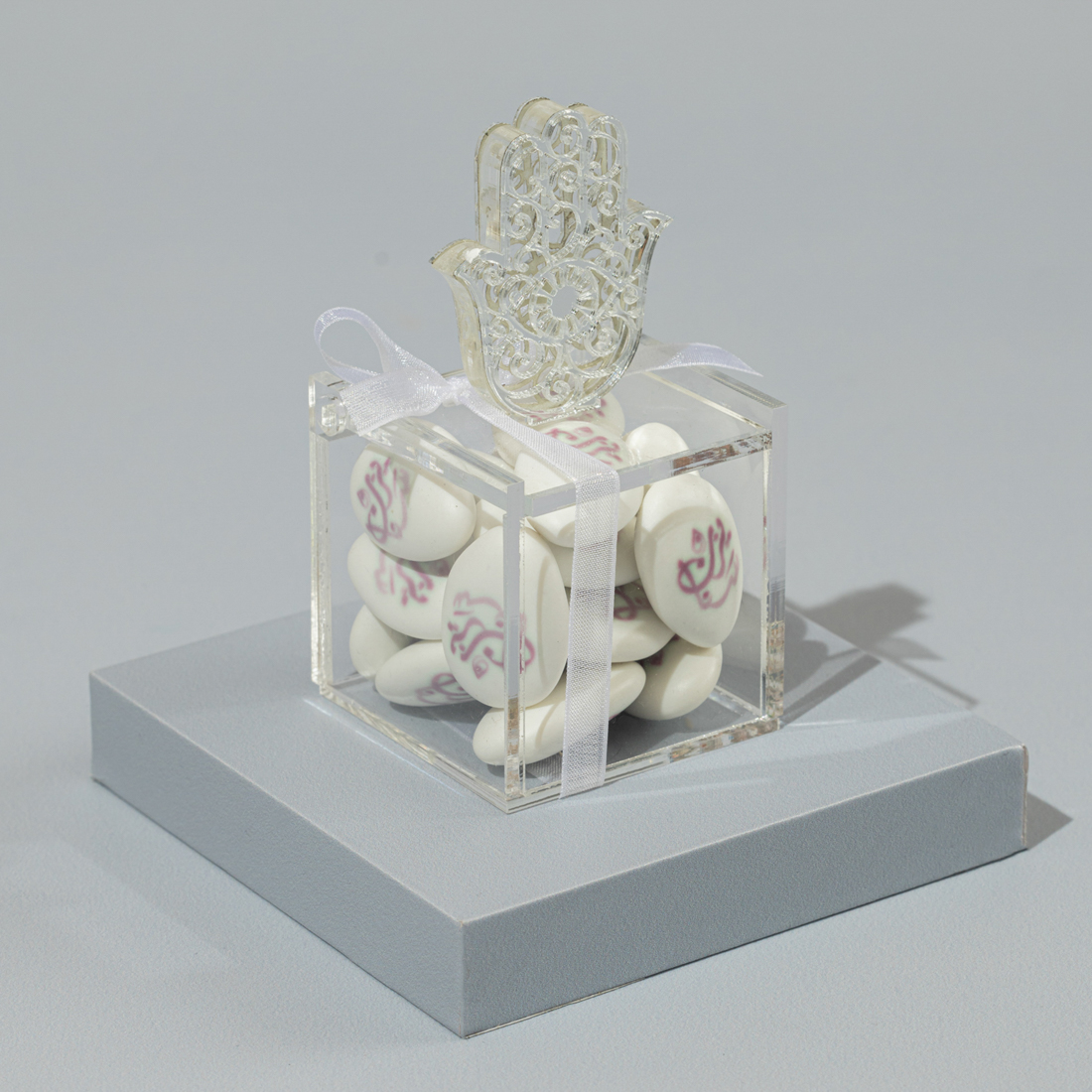 A plexi box topped with the Hand of Fatima, holding printed sugared almonds