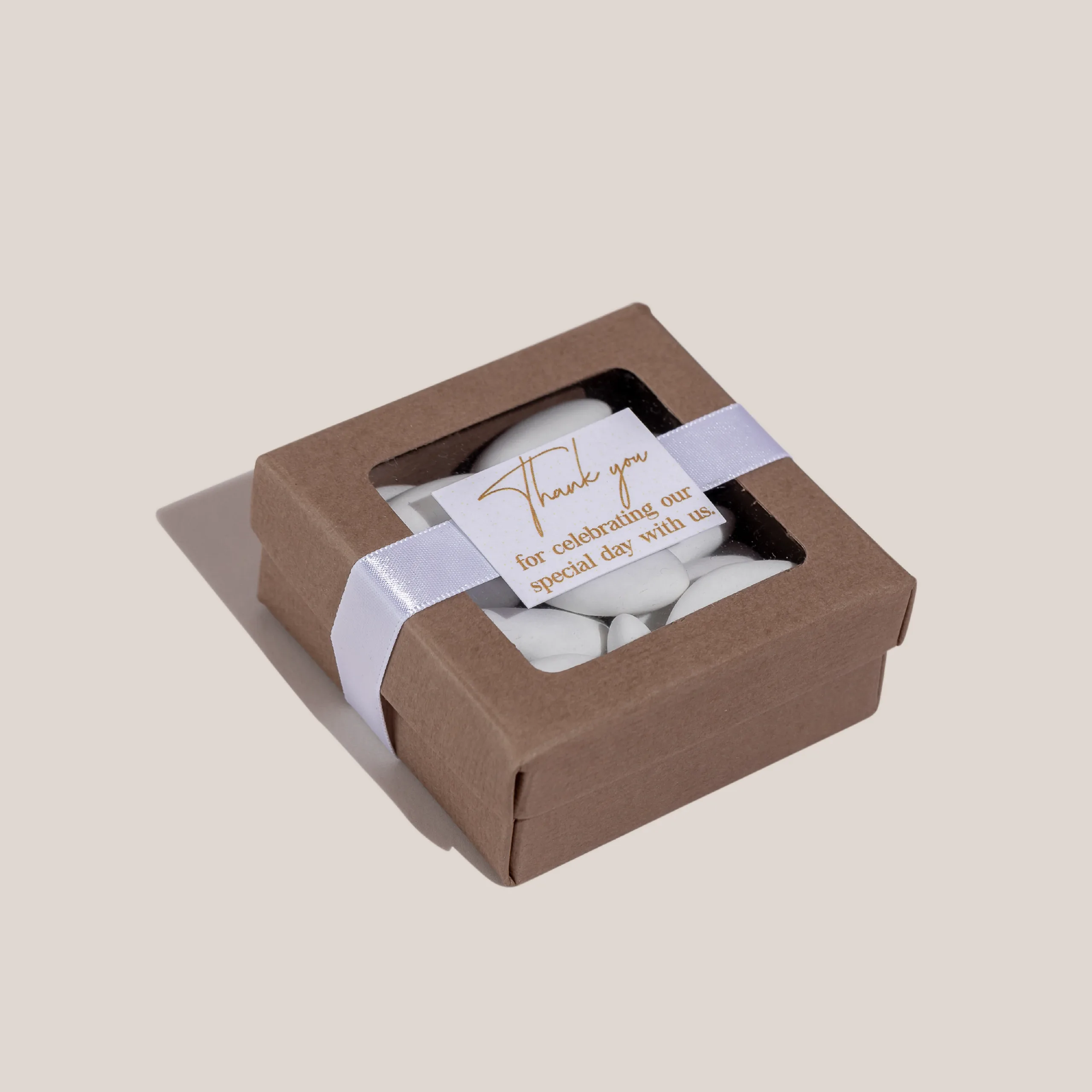 A personalized see-through gift box holding 80 grams of sugared almonds.