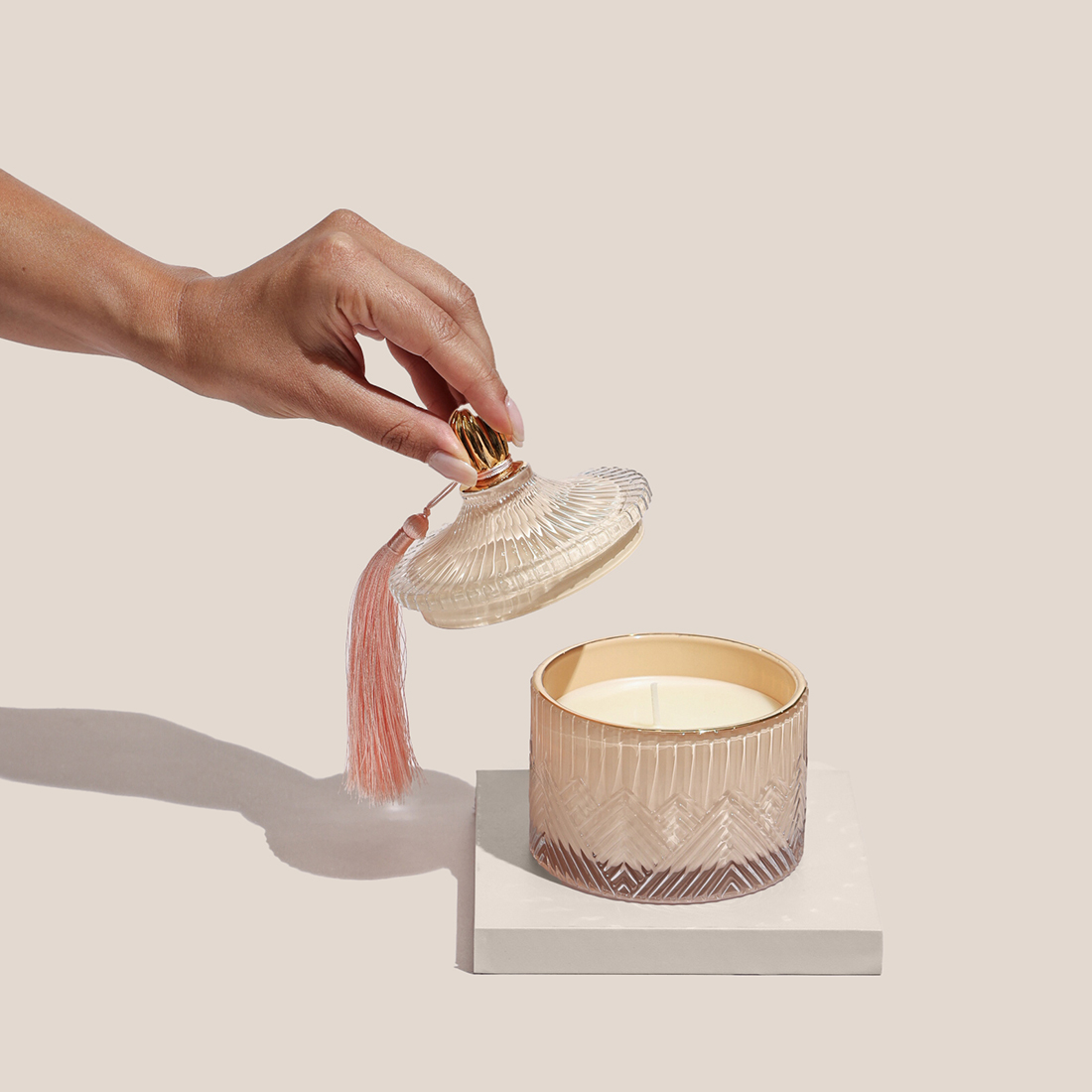 A glass candle with a lid and matching silk tassel in a floral white box.