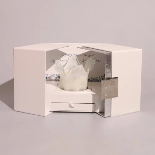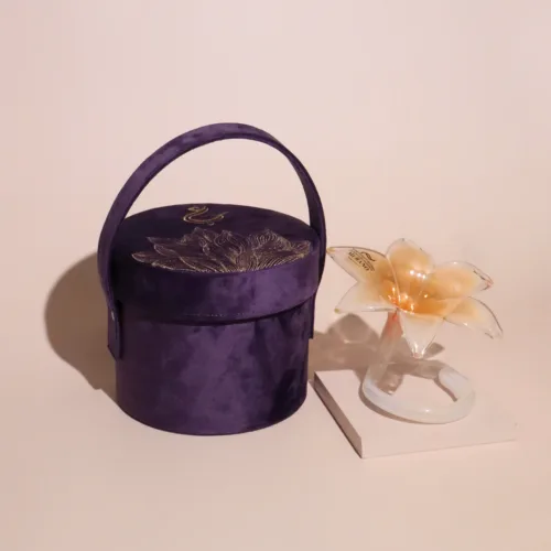 USD50A crystal bonbonniere topped with a ceramic flower, presented in a custom gift box. -